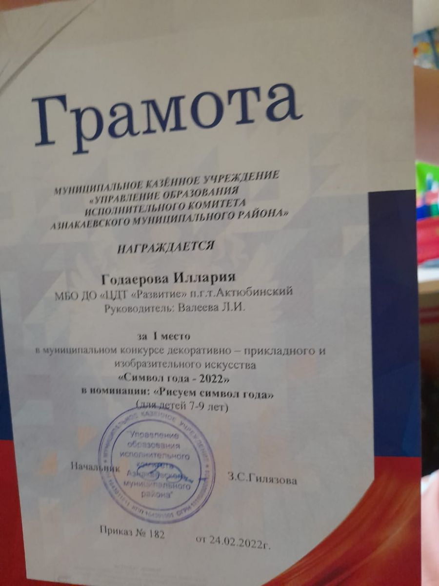 Грамота за 1 место в конкурсе "Символ года - 2022", участница Годаерова И., педагог Валеева Л.И.