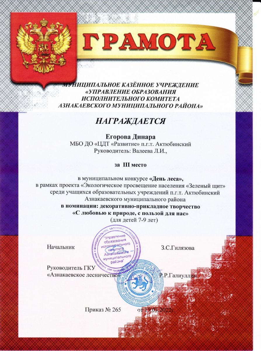 Диплом за 3 место в конкурсе "День леса", участница Егорова Д., педагог Валеева Л.И.