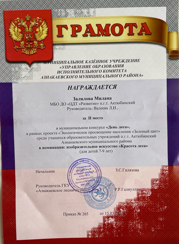 Диплом за 1 место в конкурсе "День леса", участница Залялова М., педагог Валеева Л.И.