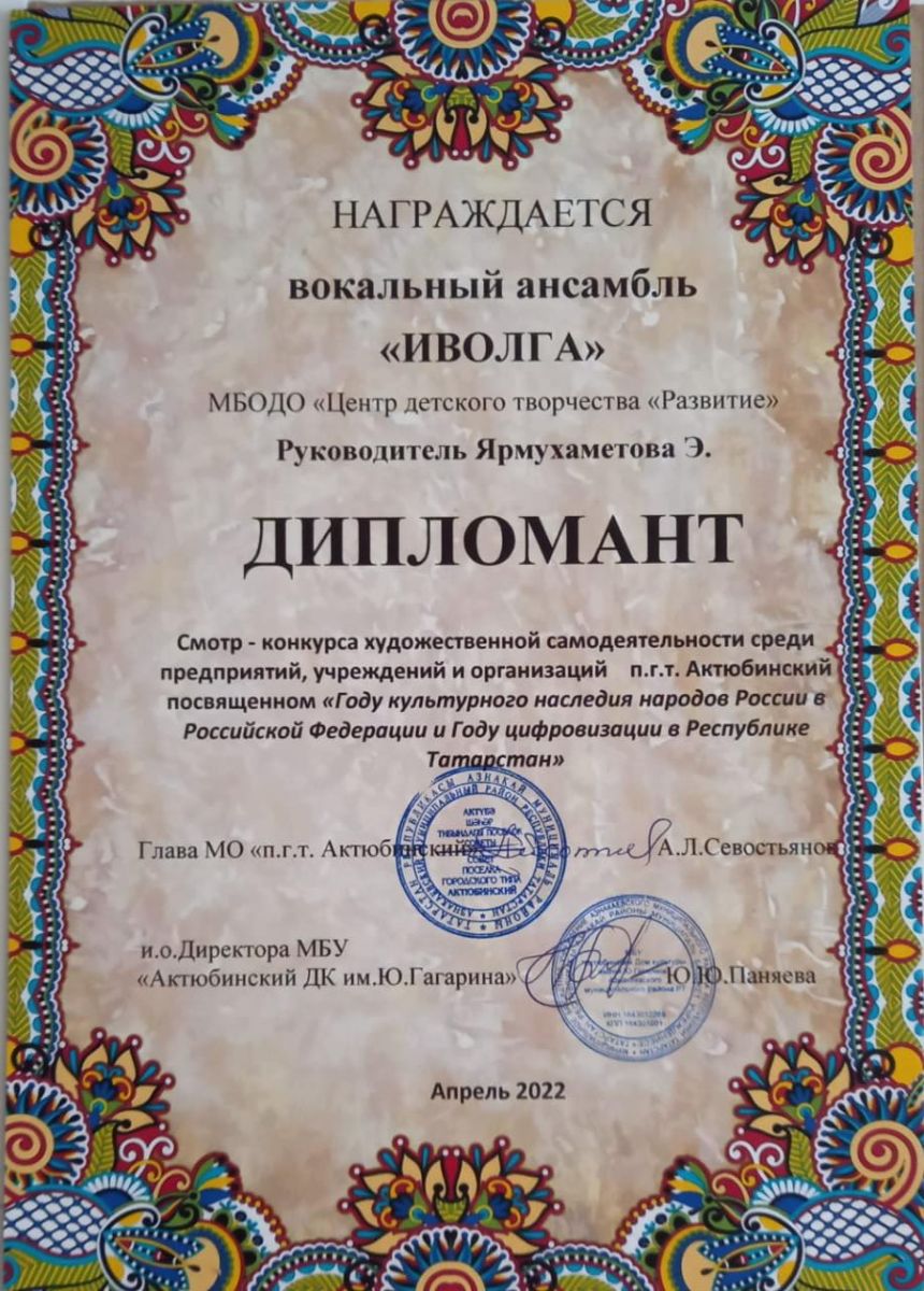 Муниципальная бюджетная организация дополнительного образования «Центр детского творчества «Развитие» п.г.т. Актюбинский Азнакаевского муниципального района Республики Татарстан
