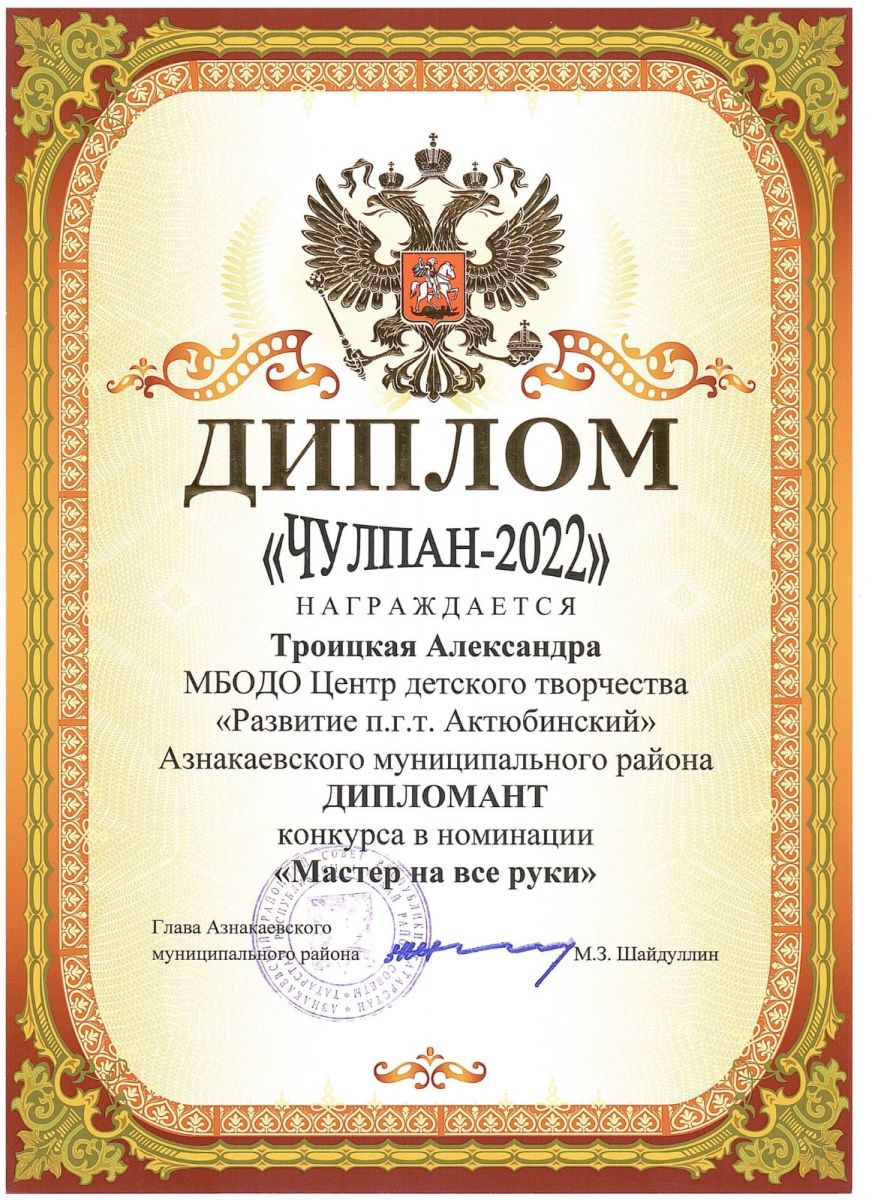Диплом "Чулпан - 2022", участница Троицкая А., педагог Шарипова Г.Ш.