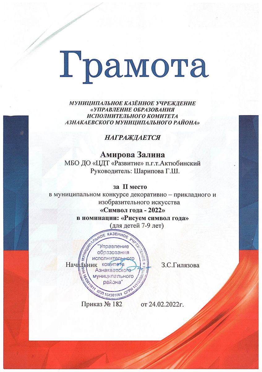 Грамота за 2 место в конкурсе "Символ года - 2022", участница Амирова З., педагог ШариповаГ.Ш.