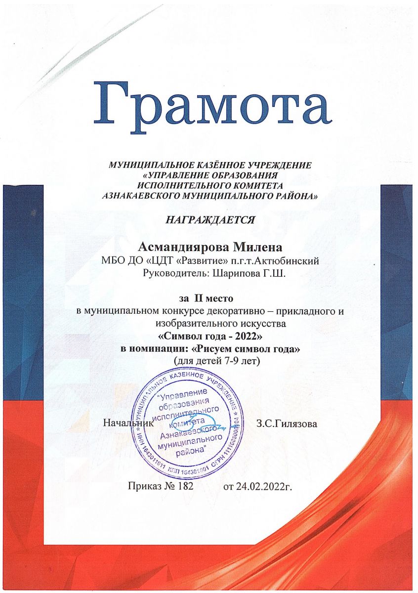 Грамота за 2 место в конкурсе "Символ года - 2022", участница Асмандиярова Д., педагог Шарипова Г.Ш.