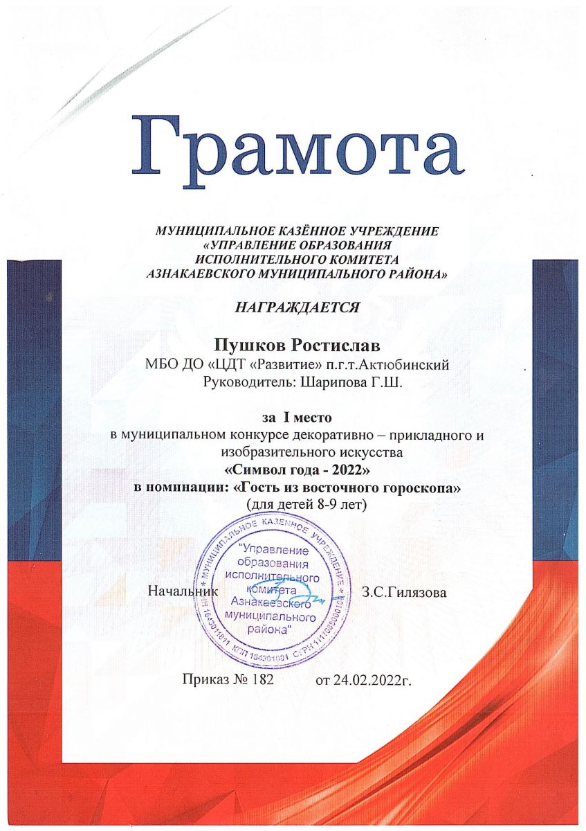 Грамота за 1 место в конкурсе "Символ года - 2022", участник Пушков Р., педагог Шарипова Г.Ш.