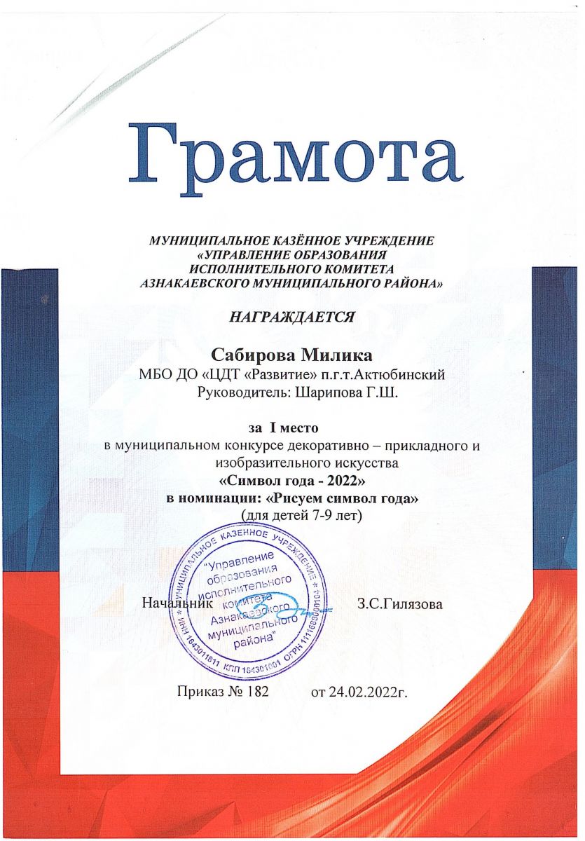 Грамота за 1 место в конкурсе "Символ года - 2022", участница Сабирова М., педагог Шарипова Г.Ш.