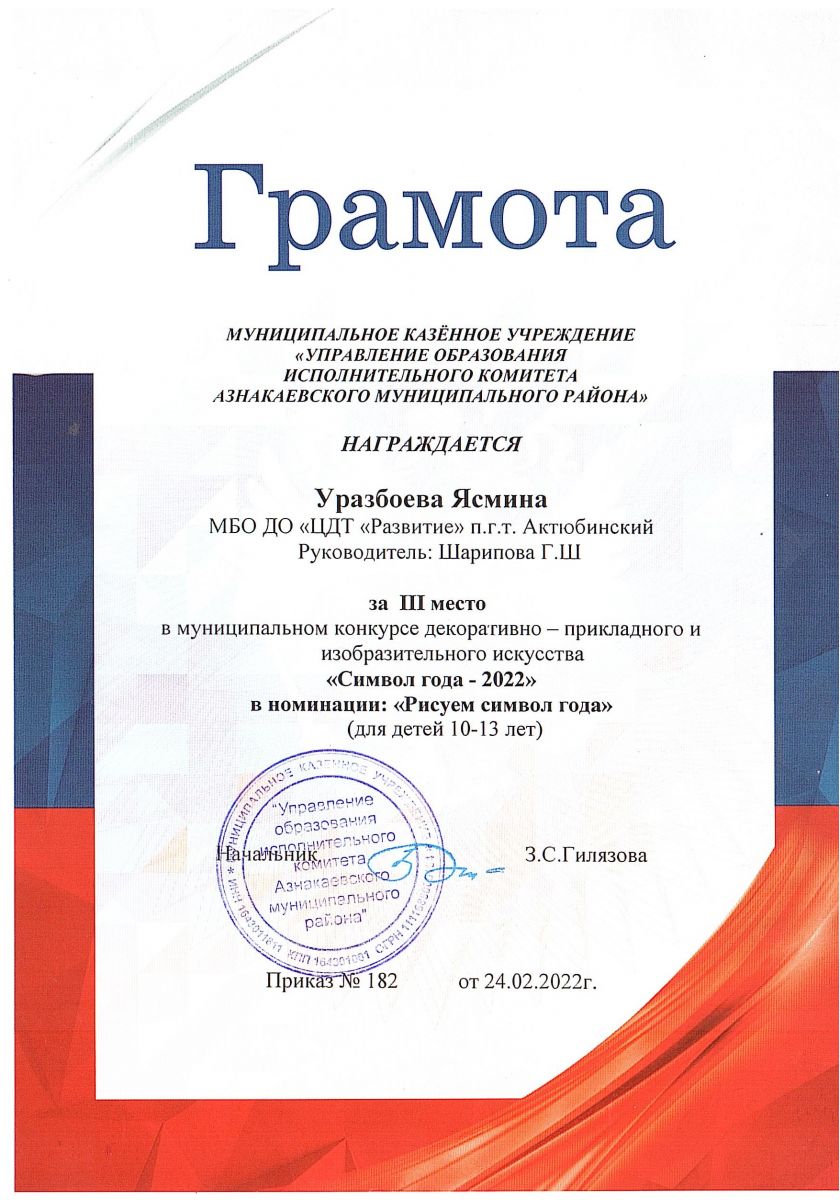 Грамота за 3 место в конкурсе "Символ года - 2022", участница Уразбоева Я., педагог Шарипова Г.Ш.