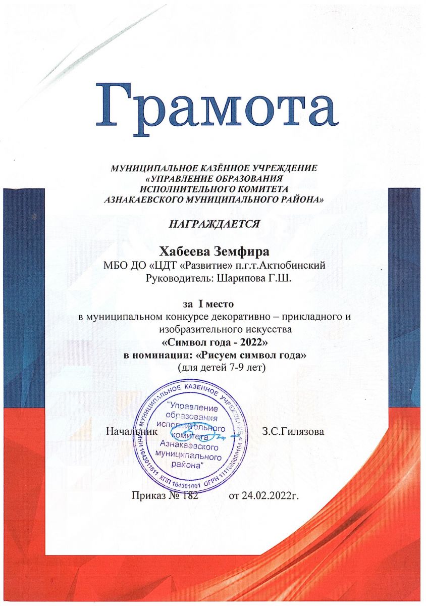 Грамота за 1 место в конкурсе "Символ года - 2022", участница Хабеева З., педагог Шарипова Г.Ш.