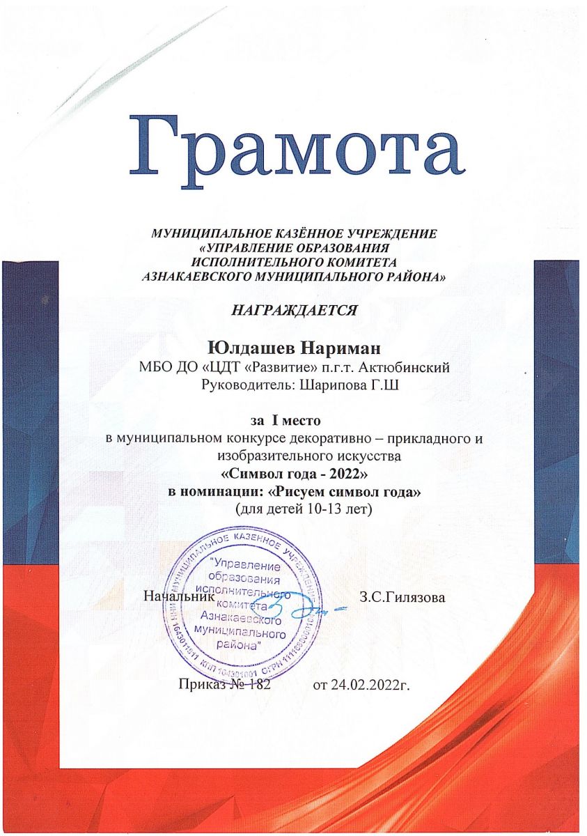 Грамота за 1 место в конкурсе "Символ года - 2022", участник Юлдашев Н., педагог Шарипова Г.Ш.