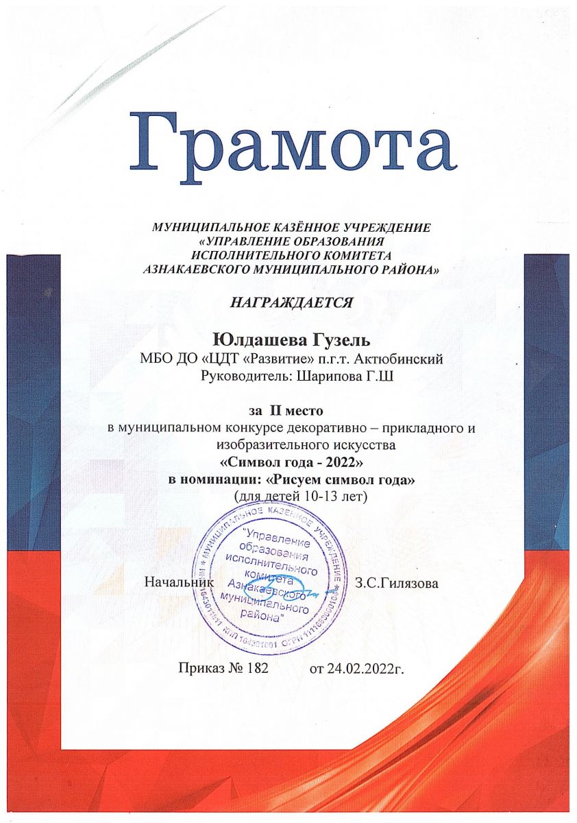 Грамота за 2 место в конкурсе "Символ года - 2022", участница Юлдашева Г., педагог Шарипова Г.Ш.