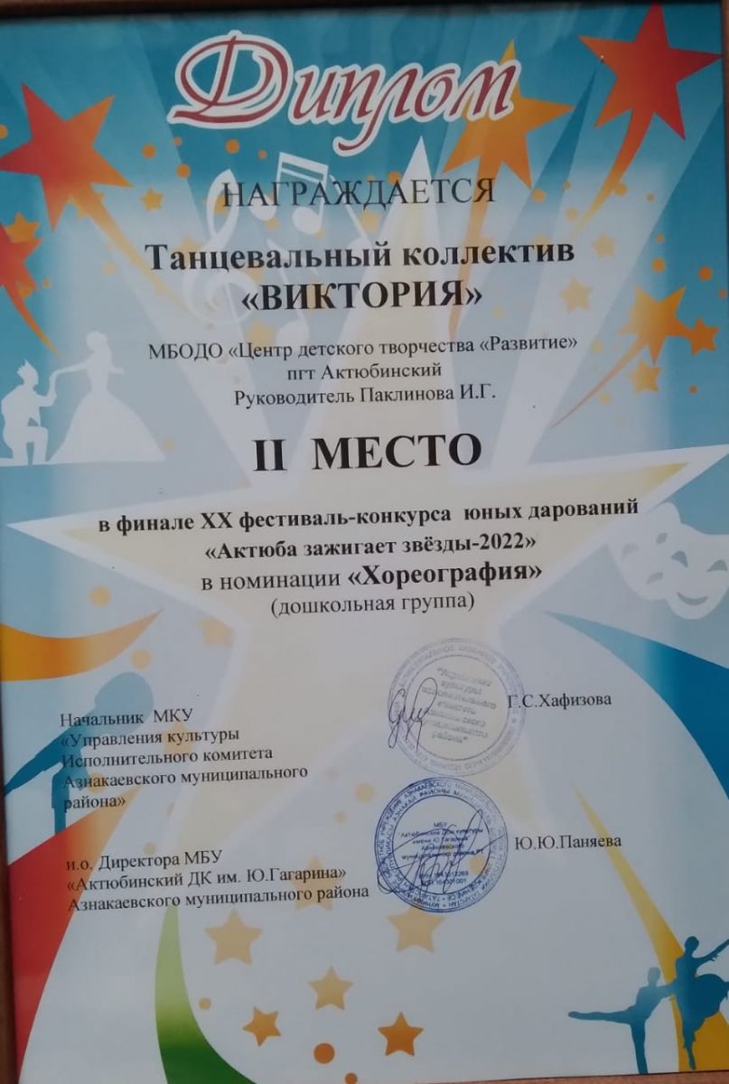 Грамота за 2 место в конкурсе "Символ года - 2022", участница Сабирова М., педагог Сабирова С.В.