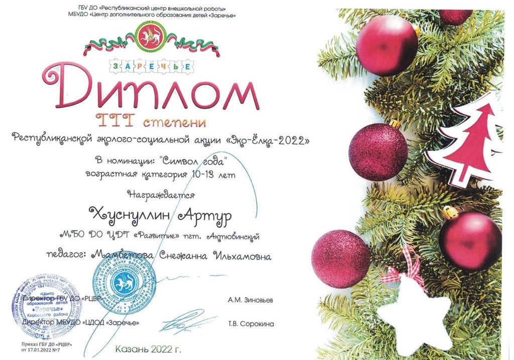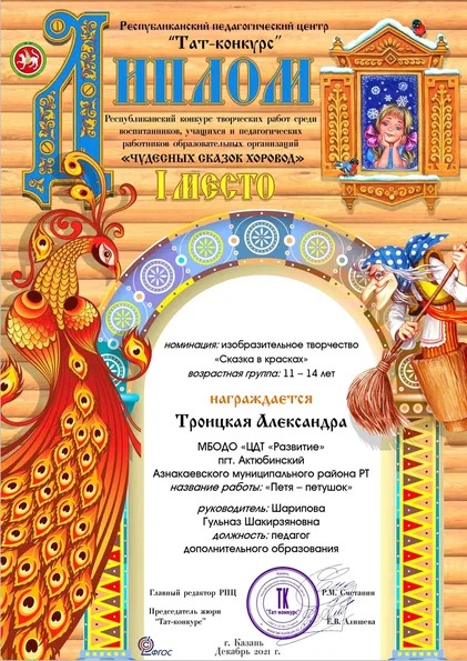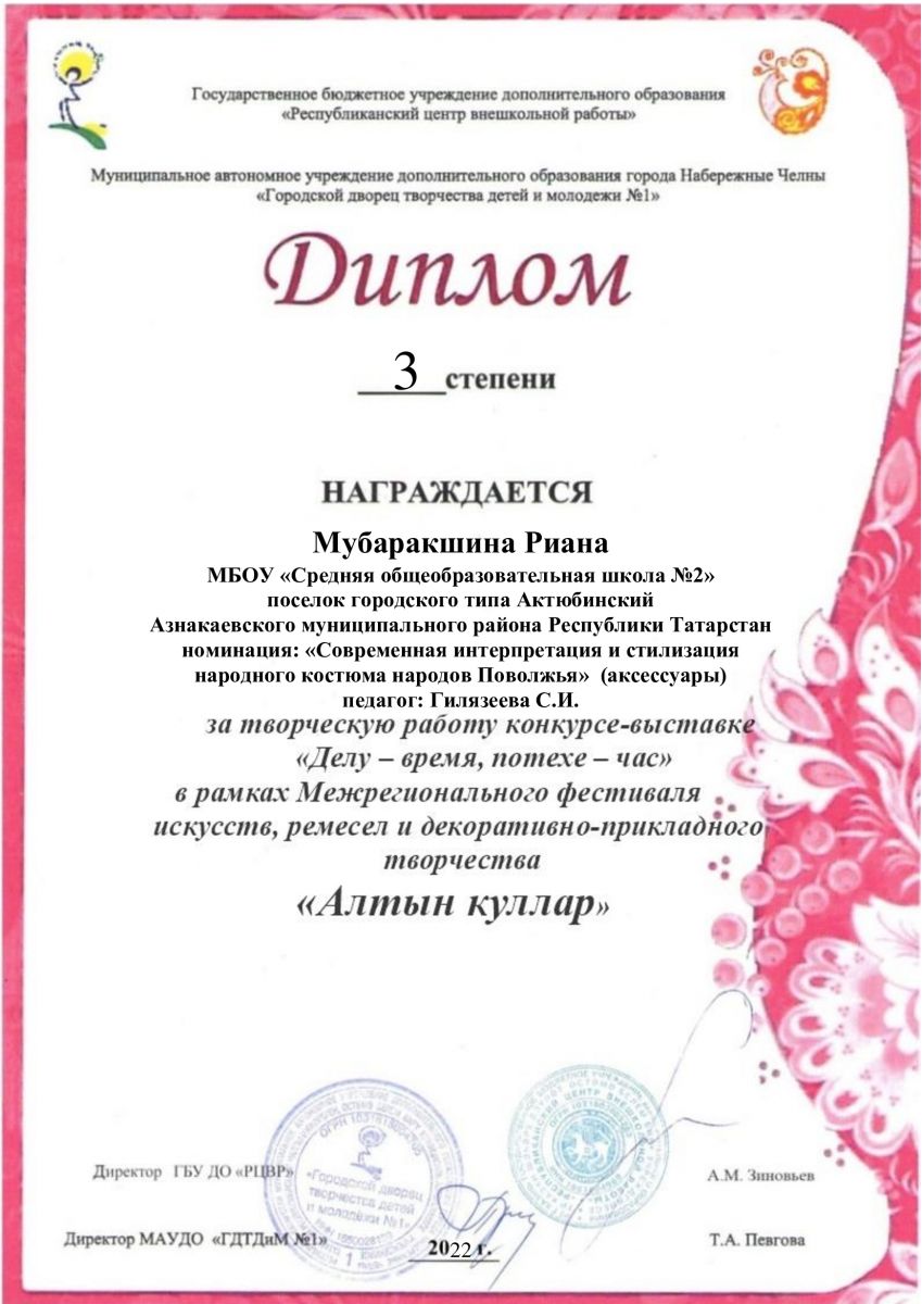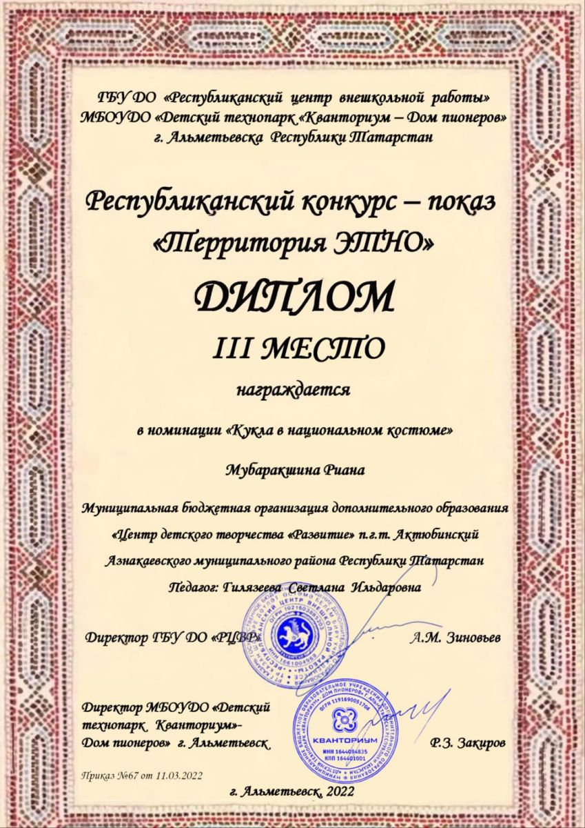 Диплом за 3 место в конкурсе "Территория ЭТНО", участница Мубаракшина Р., педагог Гилязеева С.И.