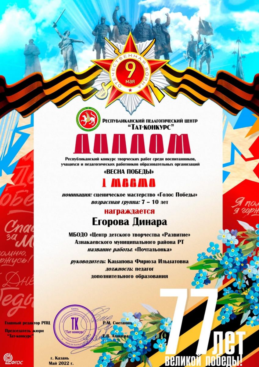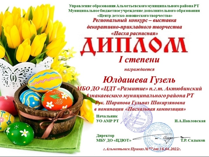 Диплом за 1 место в конкурсе "Ярмарка идей и талантов", участница Юлдашева Г., педагог Шарипова Г.Ш.