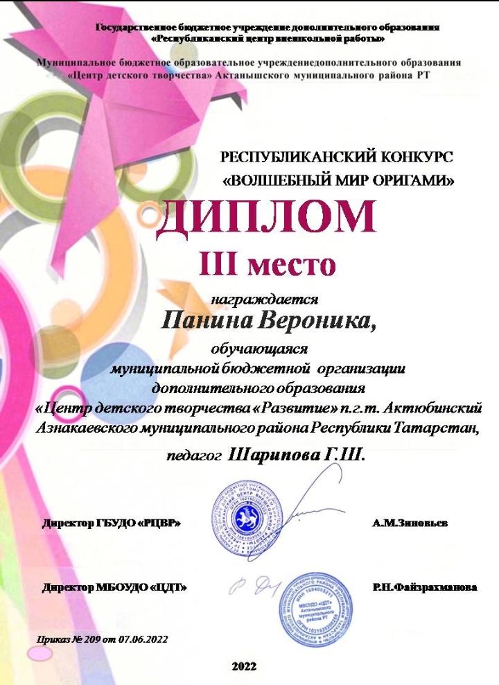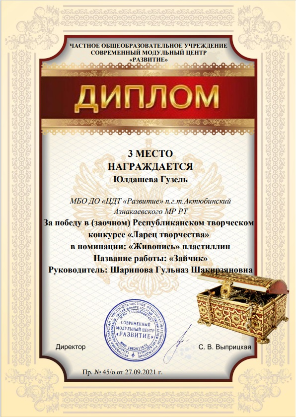 Диплом за 3 место в конкурсе "Ларец творчества", участница Юлдашева Г., педагог Шарипова Г.Ш.