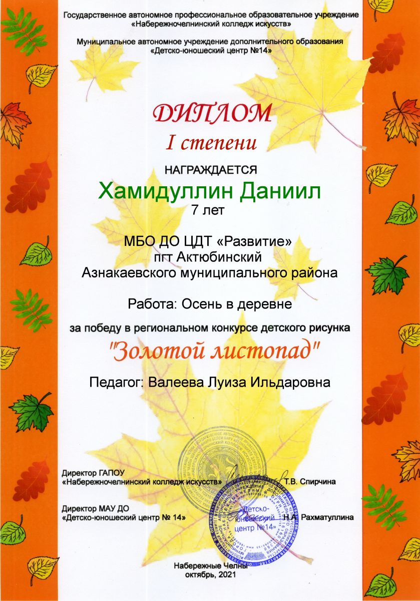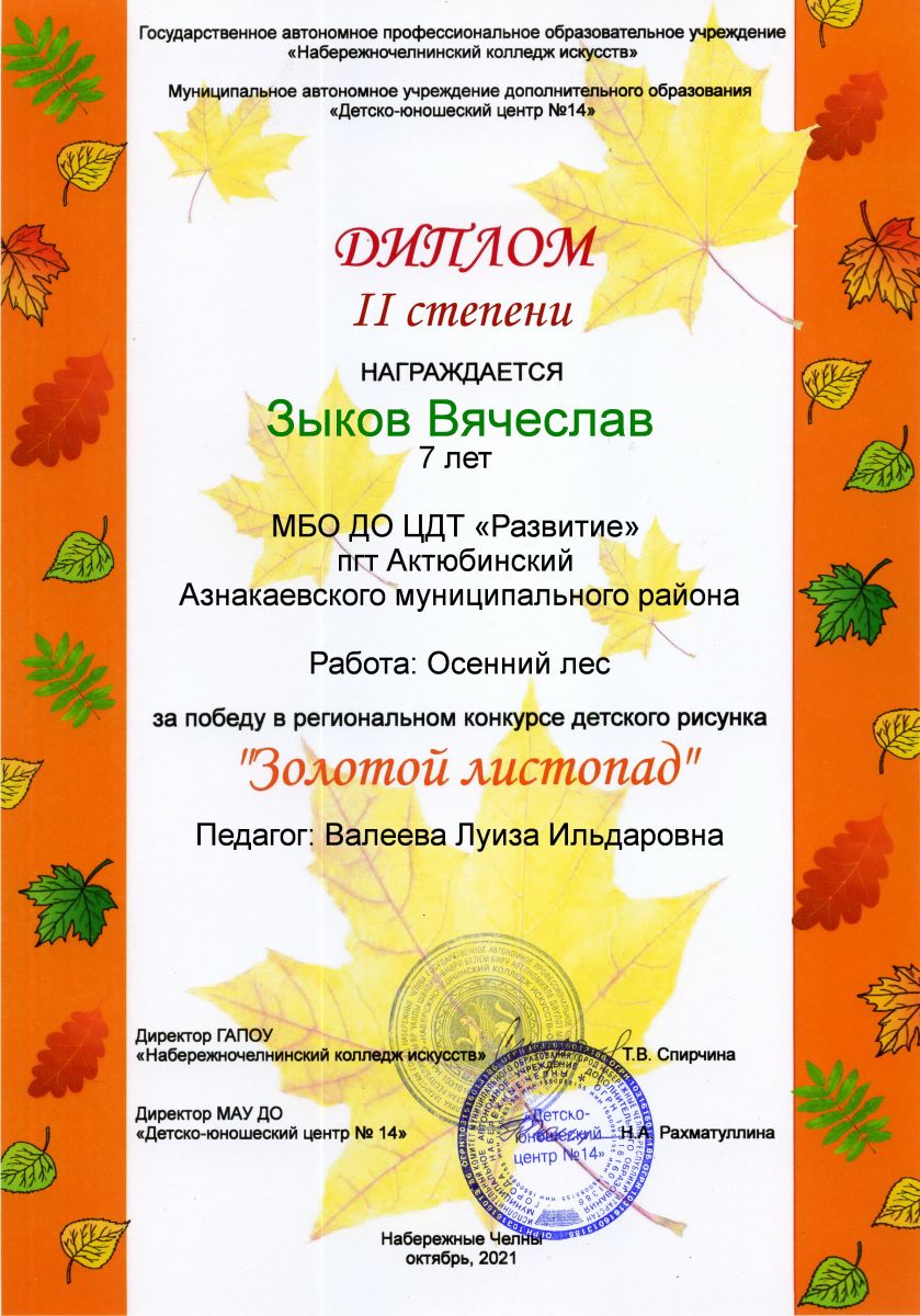 Диплом 2 степени за победу в конкурсе "Золотой листопад", участник Зыков В., педагог Валеева Л.И.