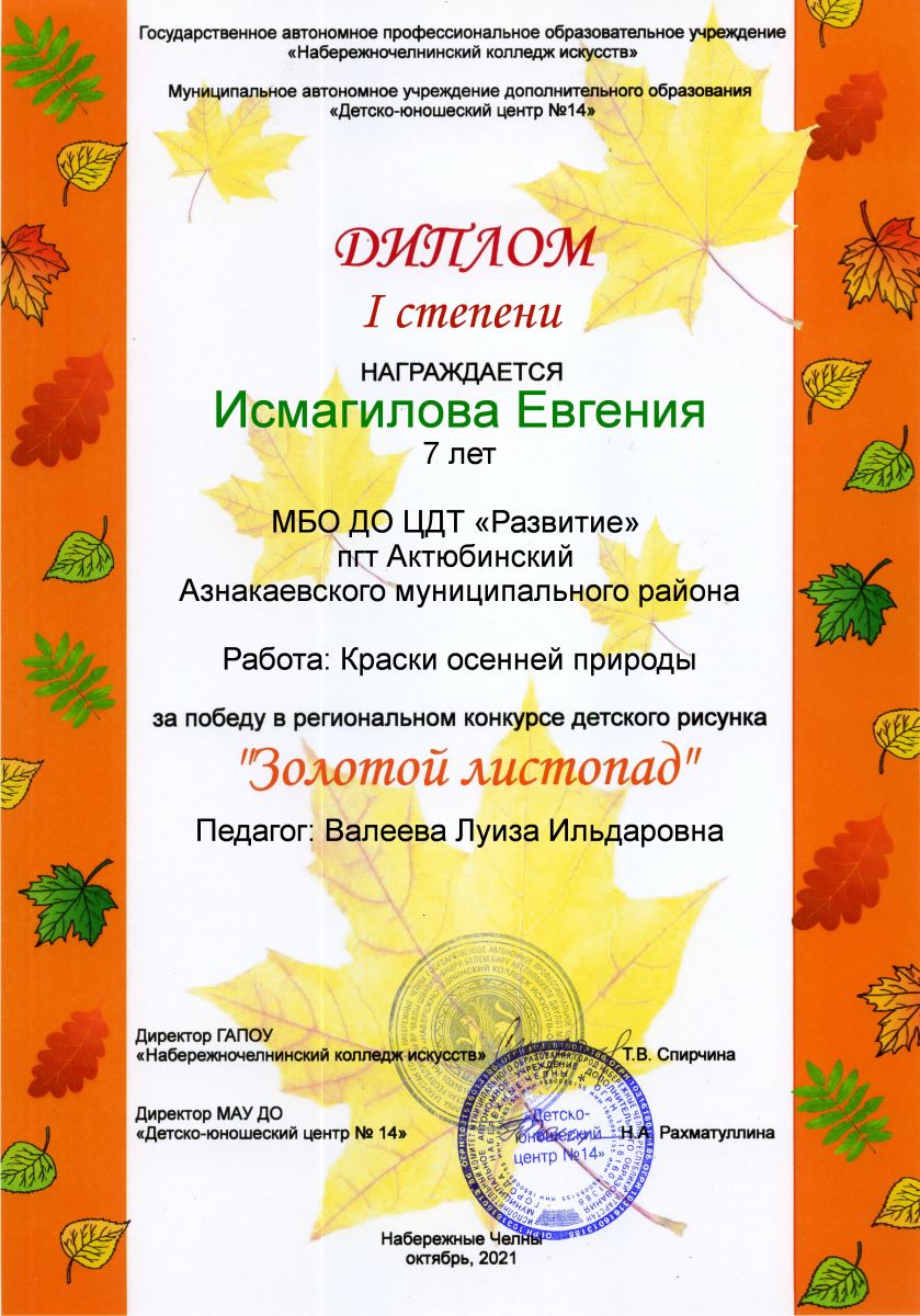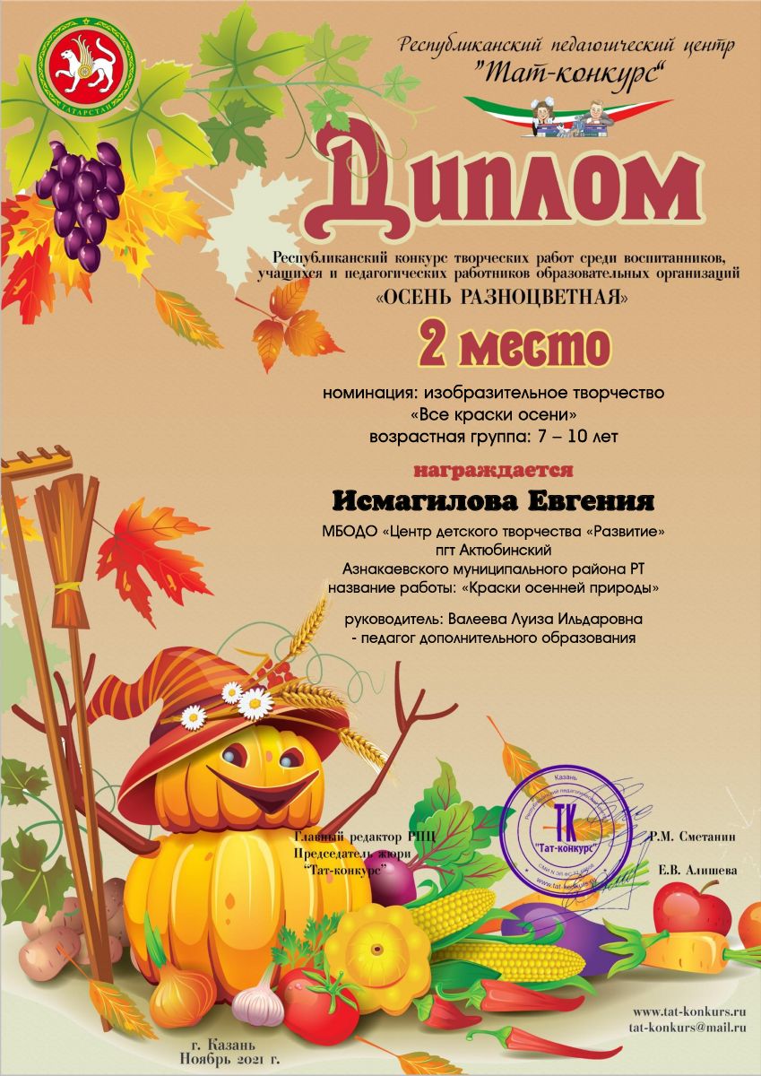 Диплом за 2 место в конкурсе "Осень разноцветная", участница Исмагилова Е., педагог Валеева Л.И.