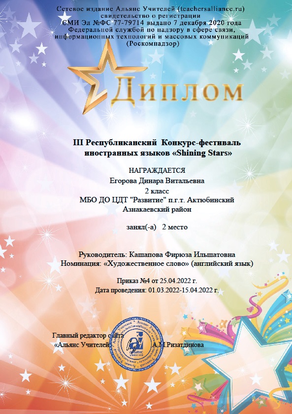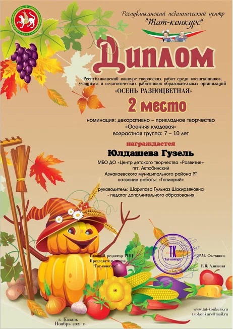 Диплом за 2 место в конкурсе "Осенняя разноцветная", участница Юлдашева Г., педагог Шарипова Г.Ш.