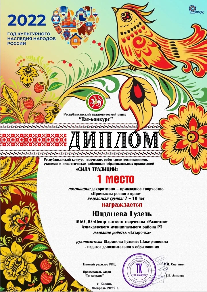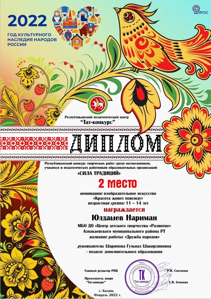 Диплом за 2 место в конкурсе "Сила традиций", участница Юлдашева Г., педагог Шарипова Г.Ш.