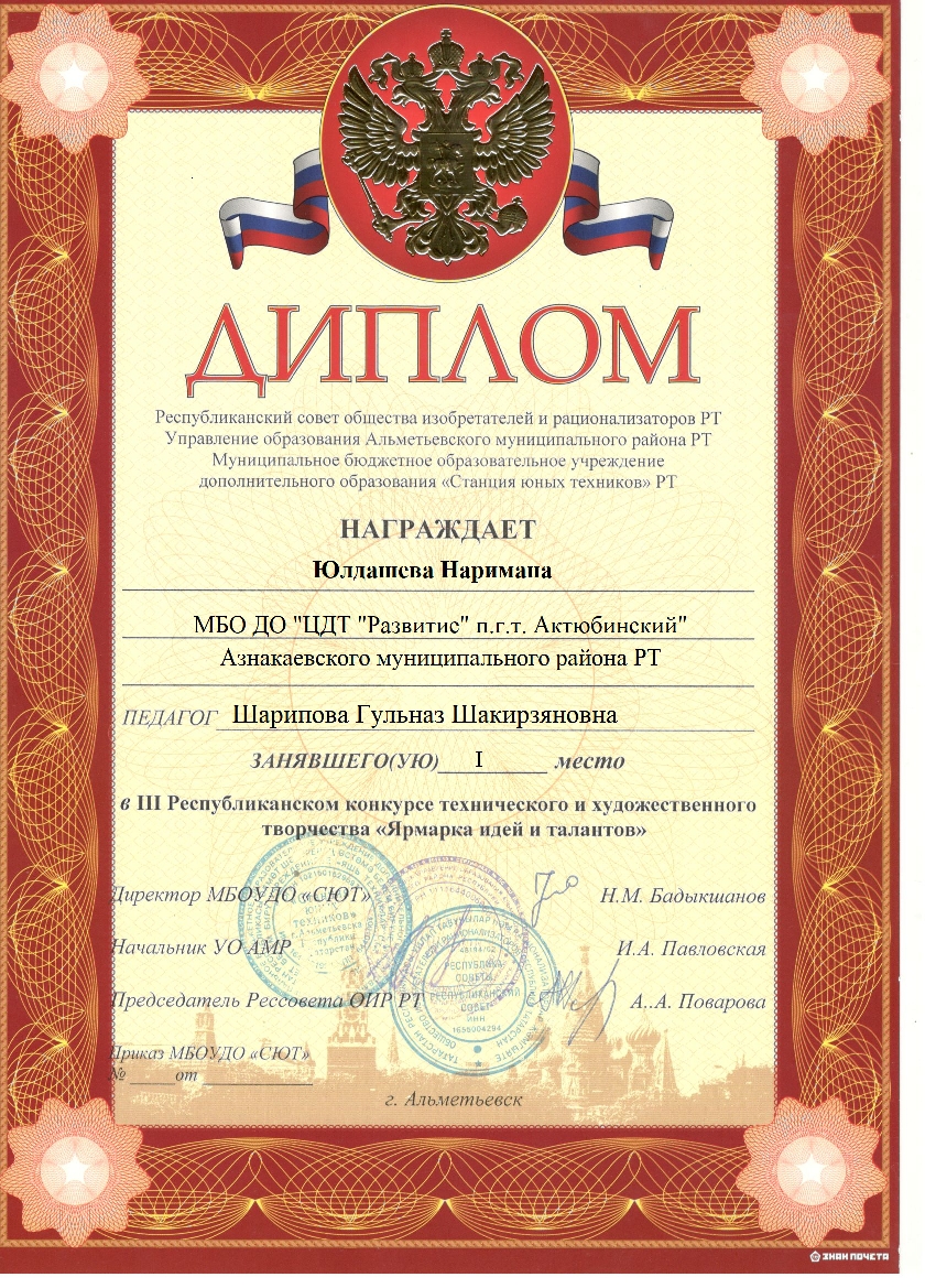 Диплом за 1 место в конкурсе "Ярмарка идей и талантов", участник Юлдашев Н., педагог Шарипова Г.Ш.