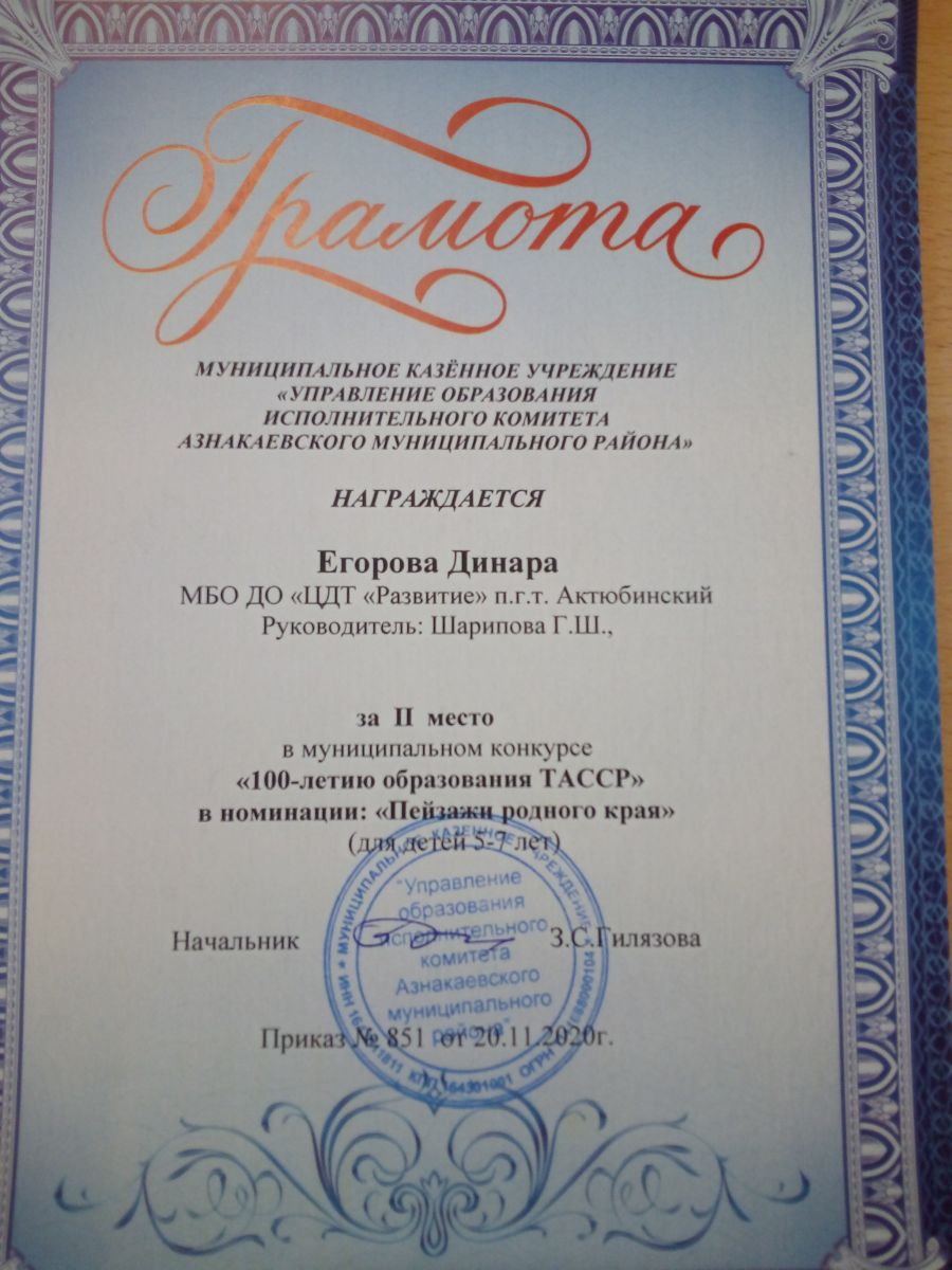 /Грамота за 2 место в номинации: "Пейзаж родного края" участник Егорова Динара рук.Шарипова Г.Ш..jpg
