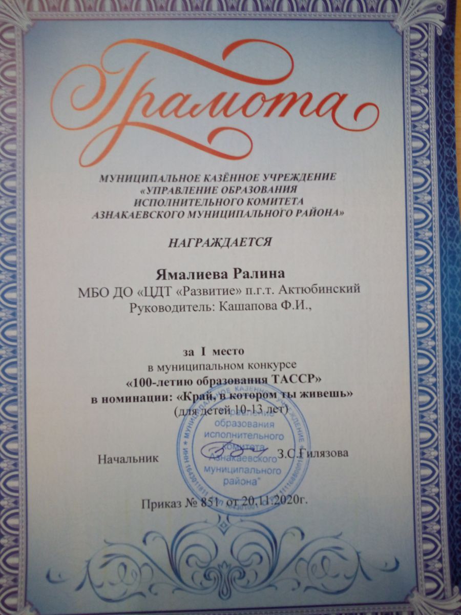 /Грамота за 1 место в конкурсе "100-летию ТАССР" участник Ямалиева Ралина рук. Кашапова Ф.И..jpg