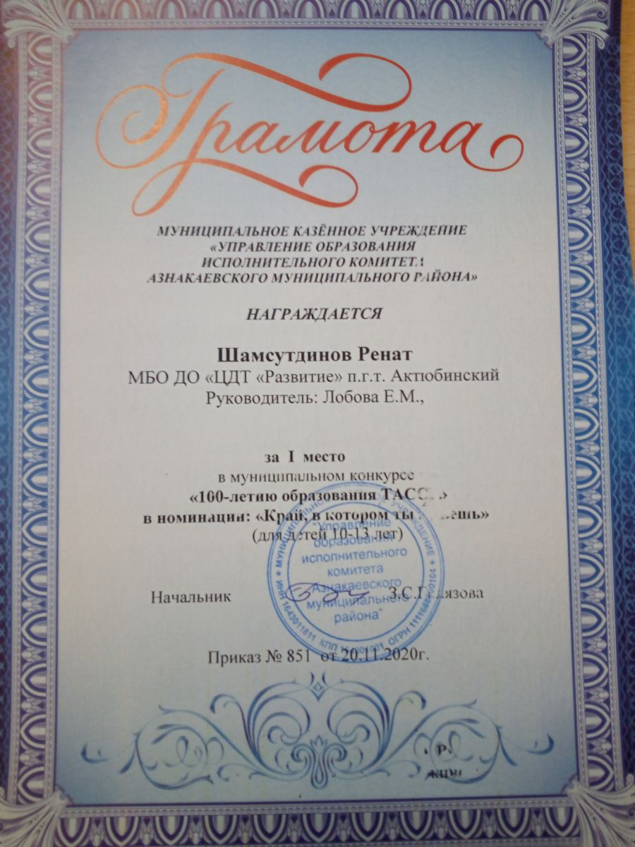 /Грамота за 1 место в конкурсе "100-летию ТАССР" участник Шамсутдинов Ренат рук. Лобова Е.М..jpg
