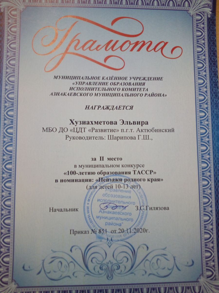 /Грамота за 1 место в номинации:"Пейзаж родного края" участник Юлдашева Гузель рук.Шарипова Г.Ш.jpg
