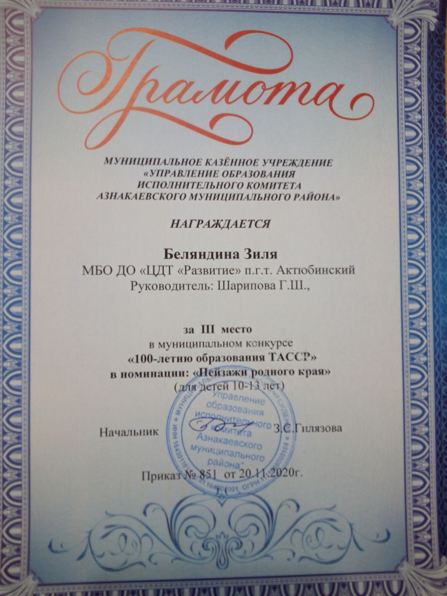 /Грамота за 3 место в конкурсе "100-летию ТАССР" участник Беляндина Зиля рук. Шарипова Г.Ш. .jpg