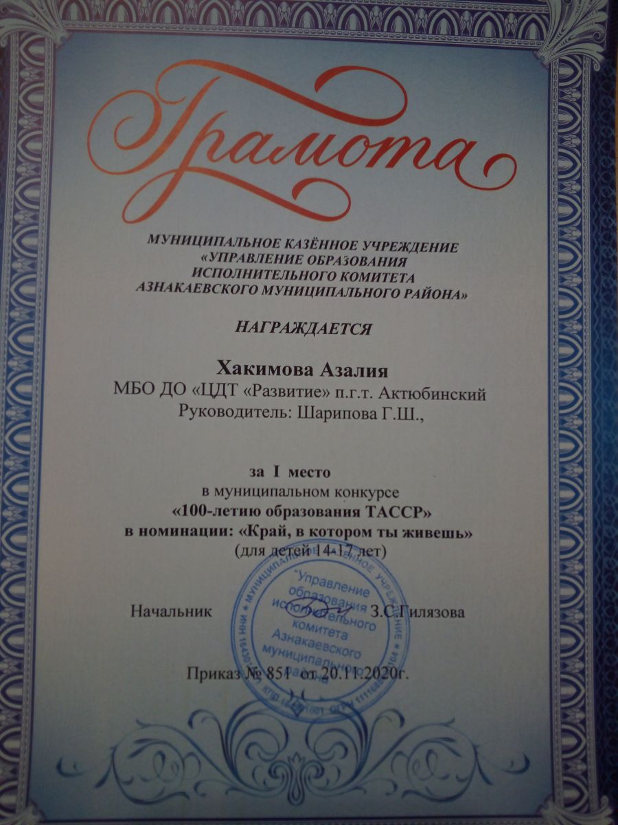 /Грамота за 1 место в конкурсе "100-летию ТАССР" участник Хакимова Азалия рук.Шарипова Г.Ш.jpg