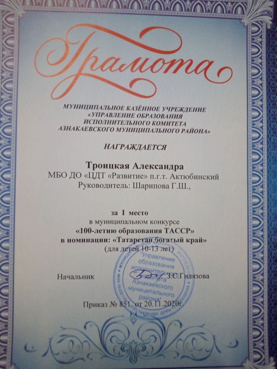 /Грамота за 1 место в конкурсе "100-летию ТАССР" участник Троицкая Александра рук. Шарипова Г.Ш..jpg