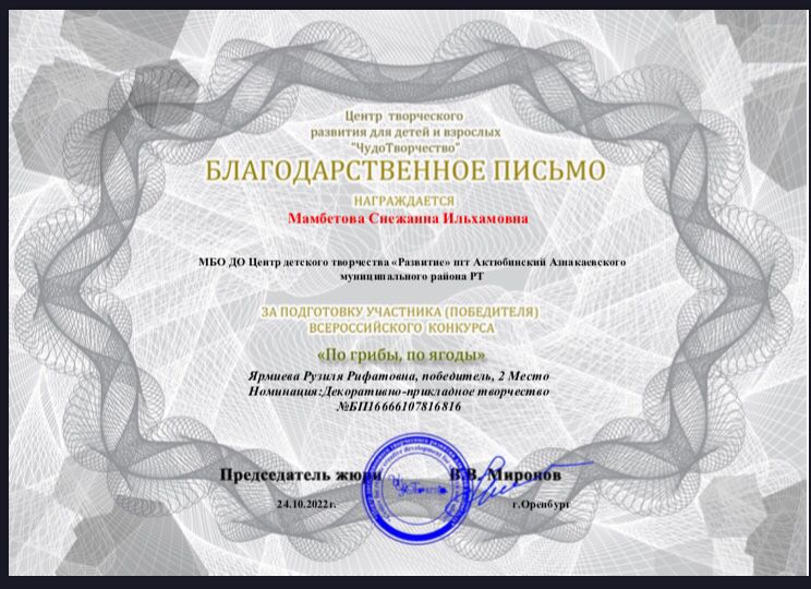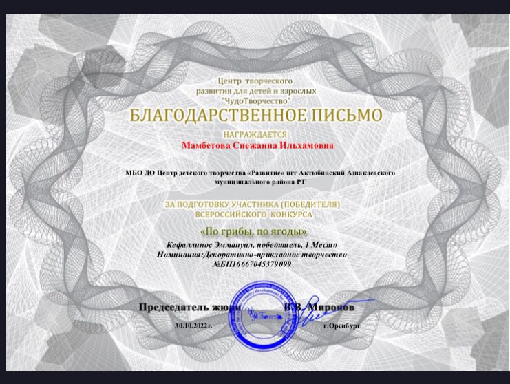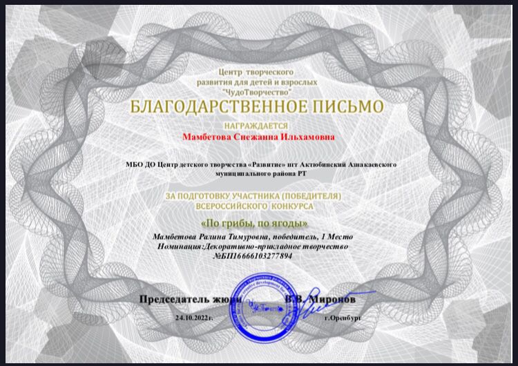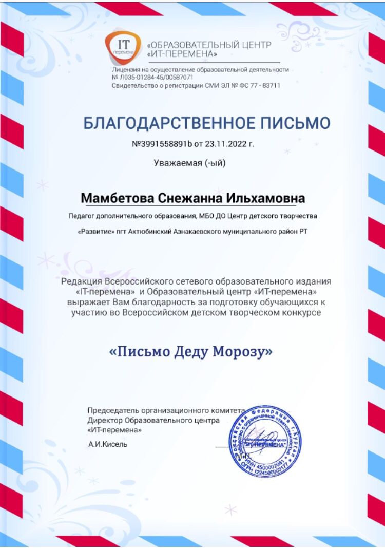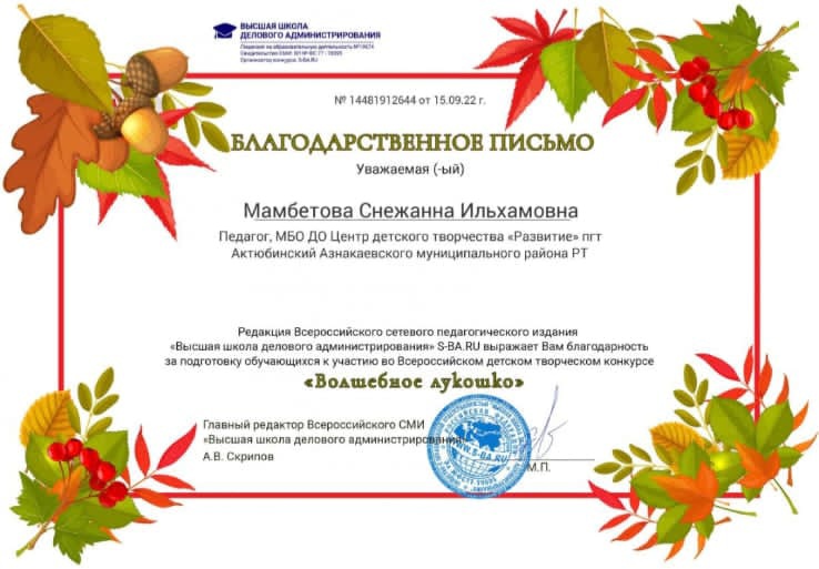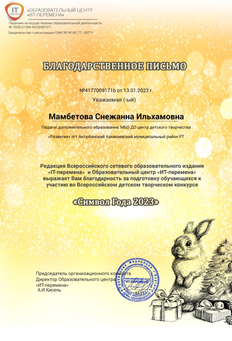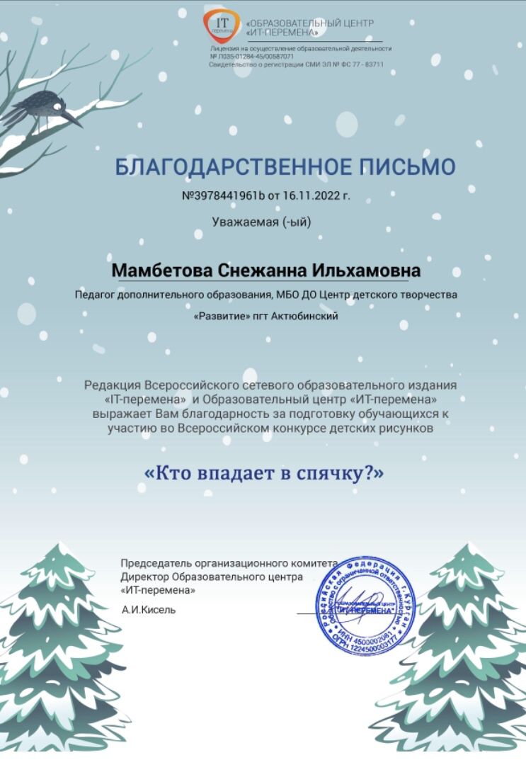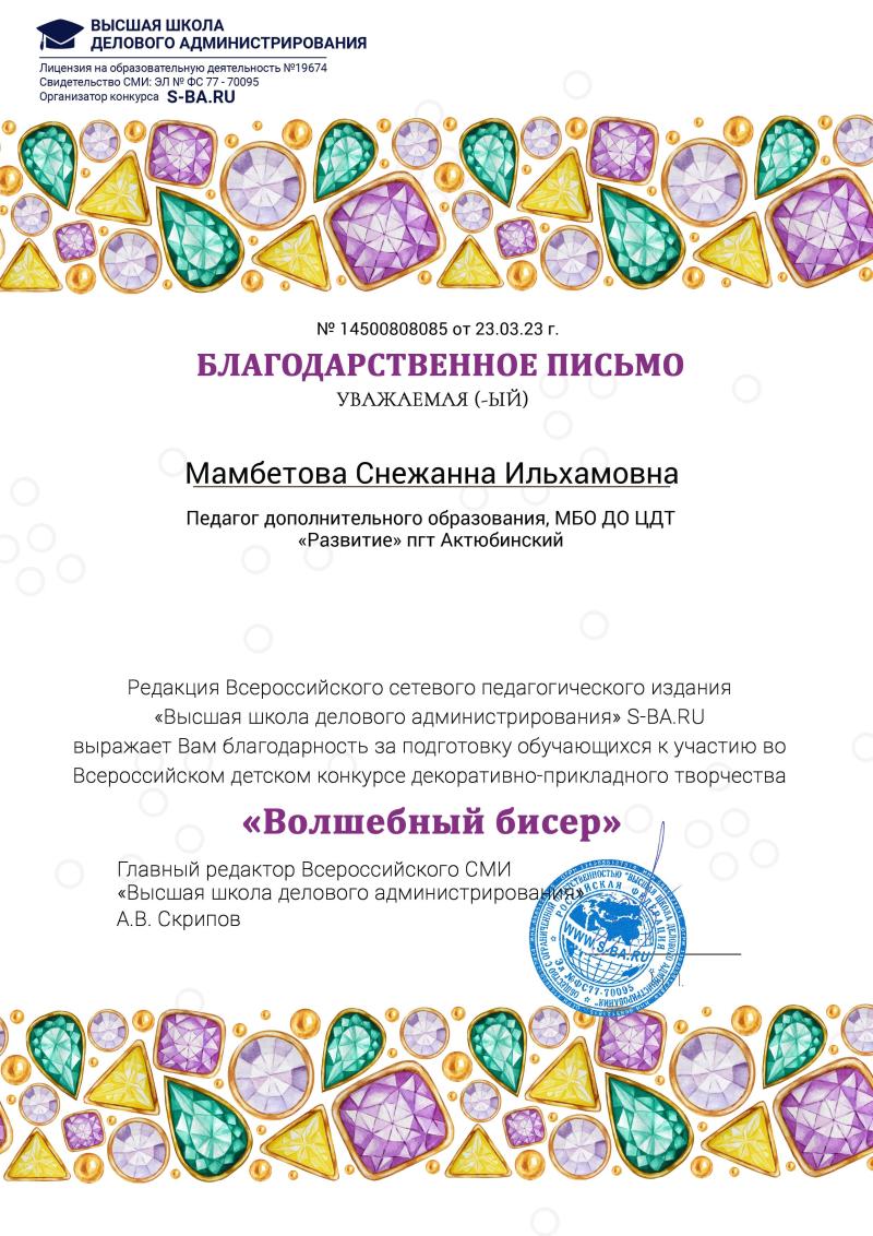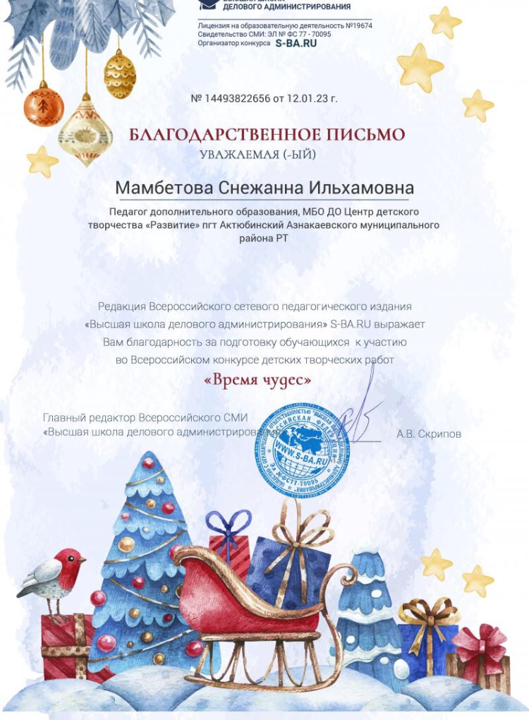 Благодарственное письмо за подготовку обучающихся к конкурсу "Время чудес", педагог Мамбетова С.И.