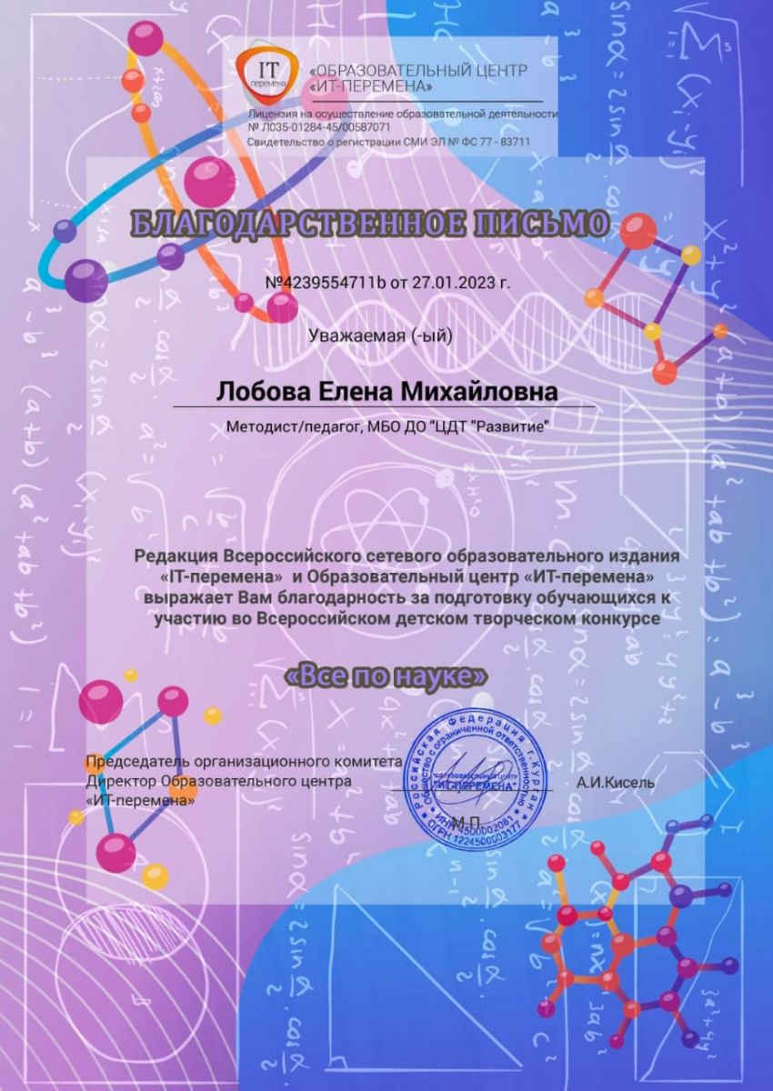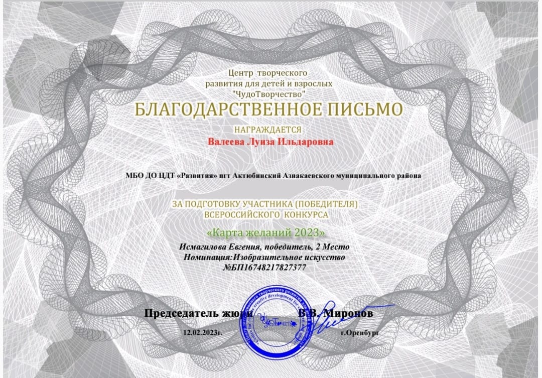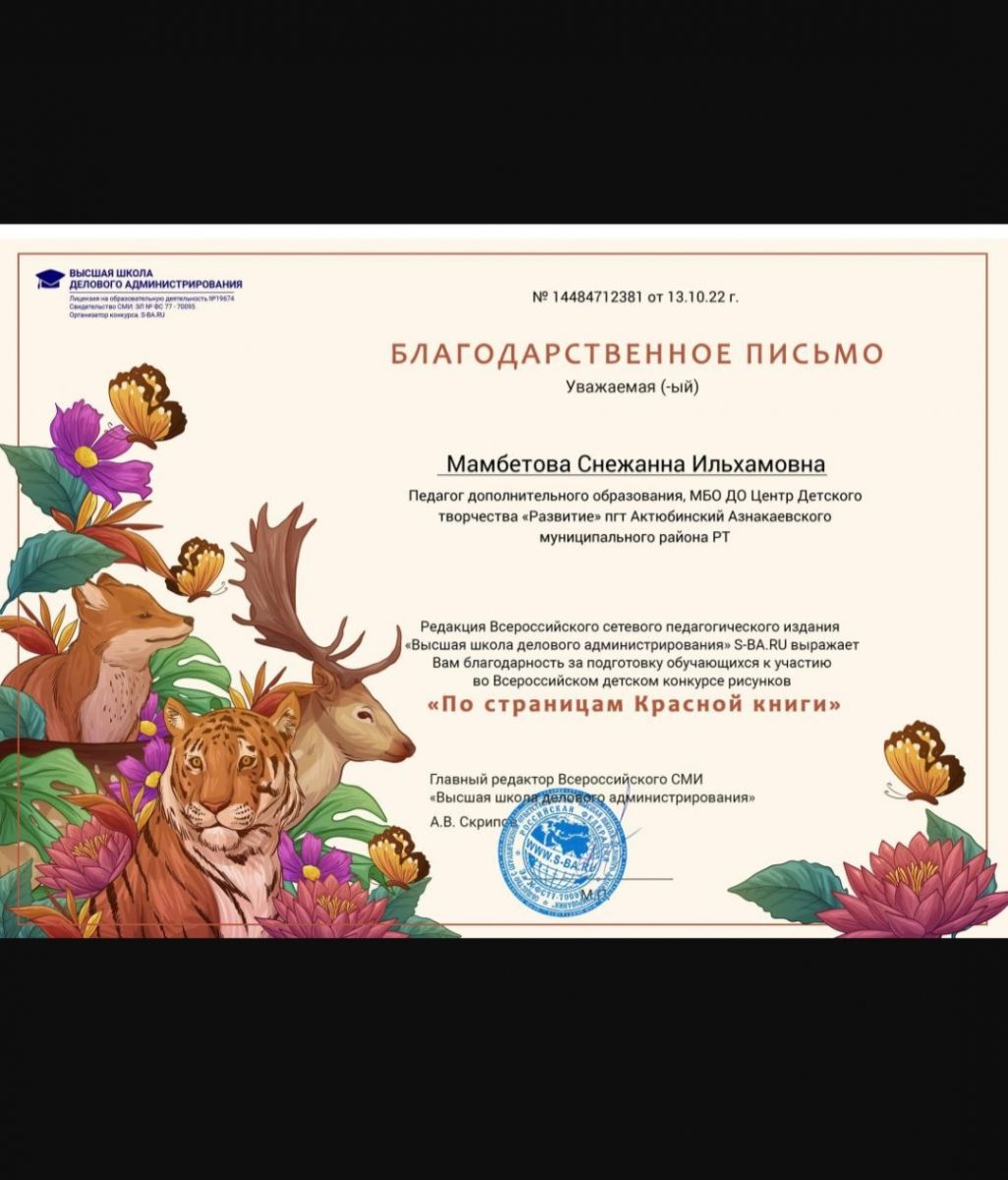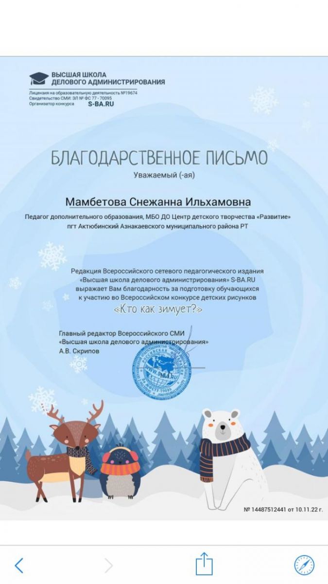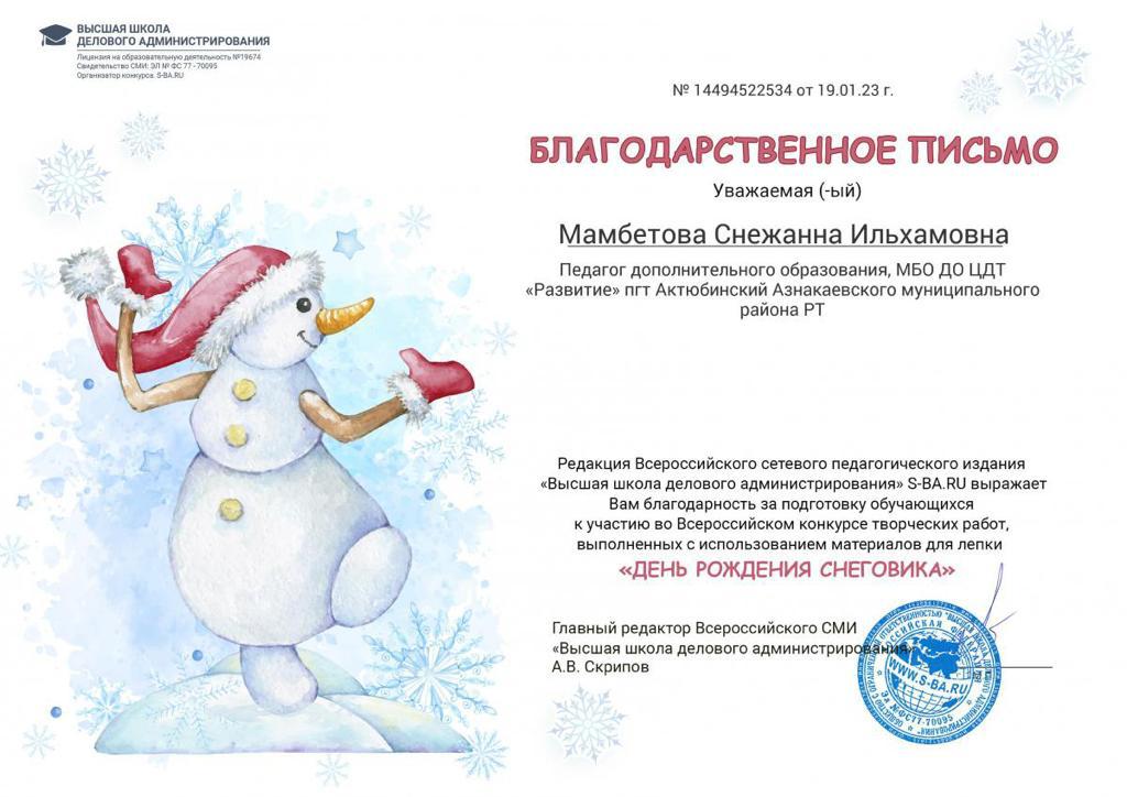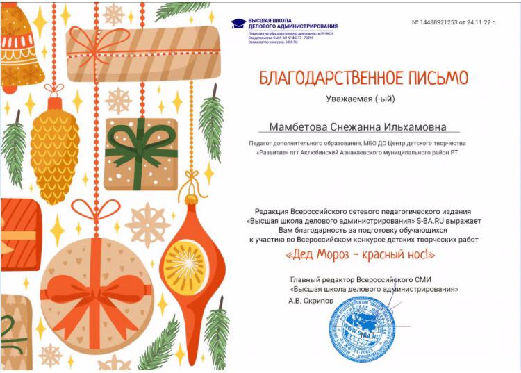 Благодарственное письмо за подготовку обучающихся к конкурсу "Время чудес", педагог Мамбетова С.И.