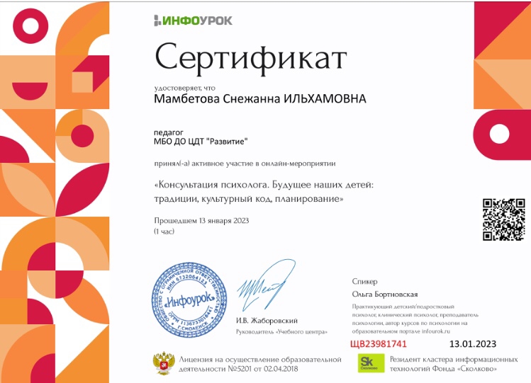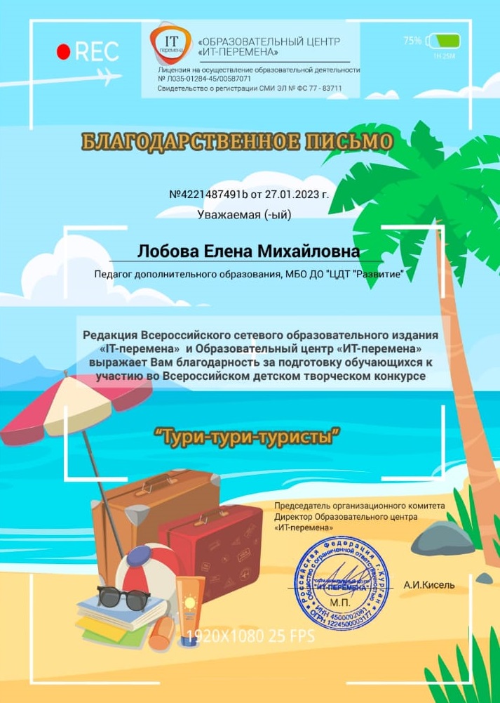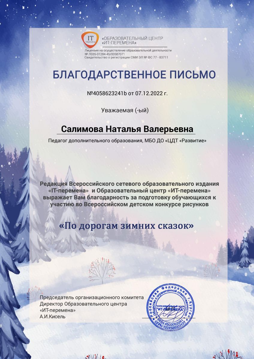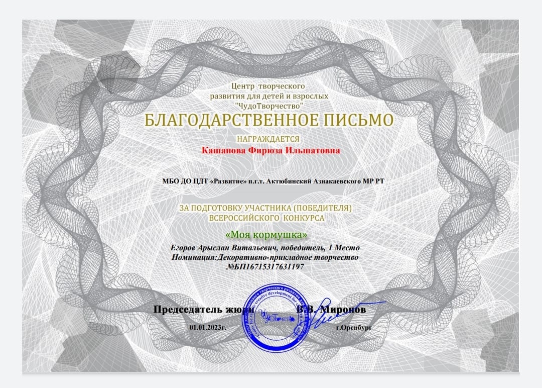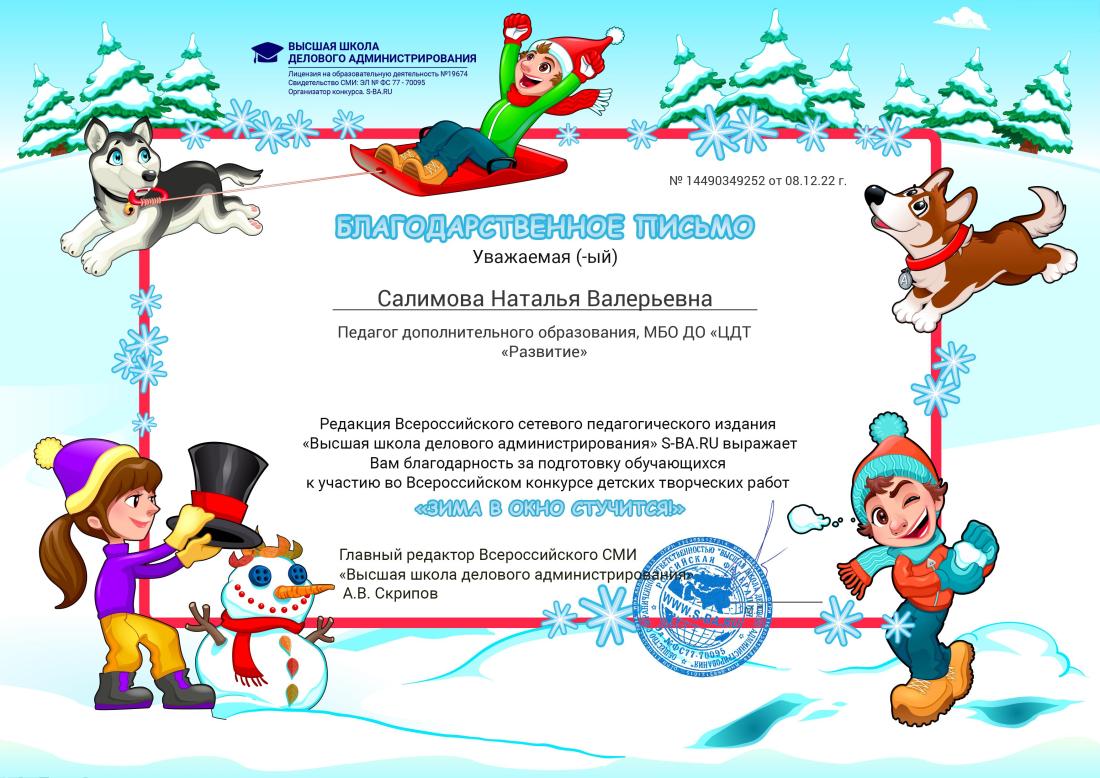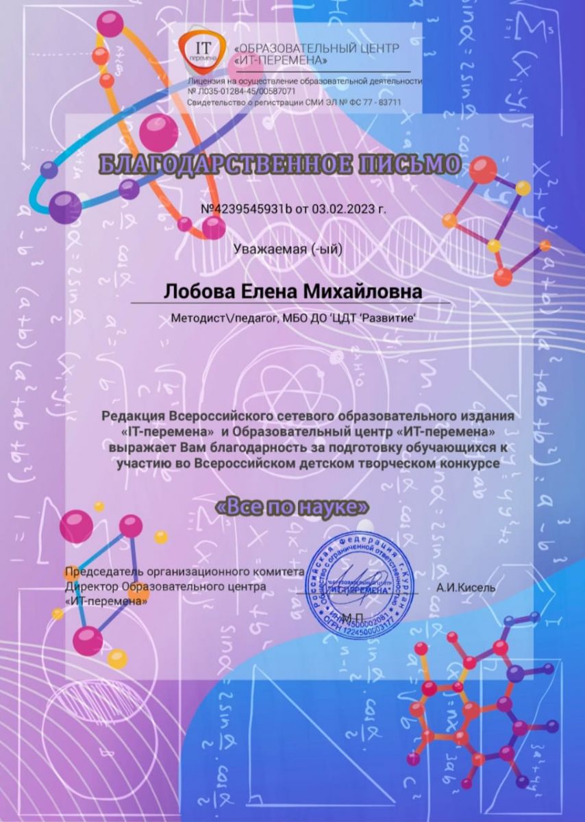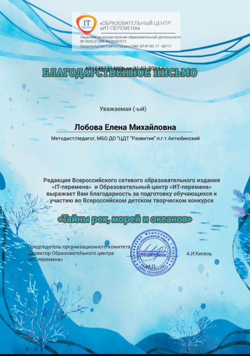 Благодарственное письмо за подготовку обучающихся к конкурсу "Время чудес", педагог Мамбетова С.И.