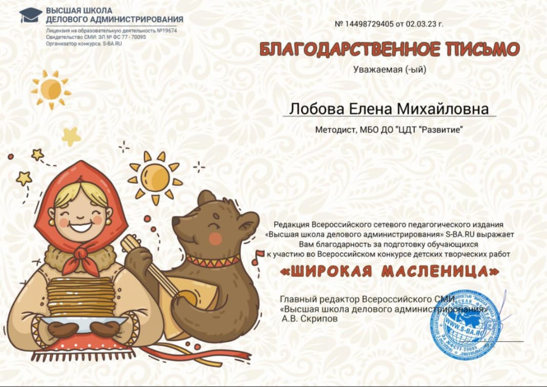 Диплом педагога-наставника в конкурсе "Масленница широкая", педагог Паклинова И.Г.