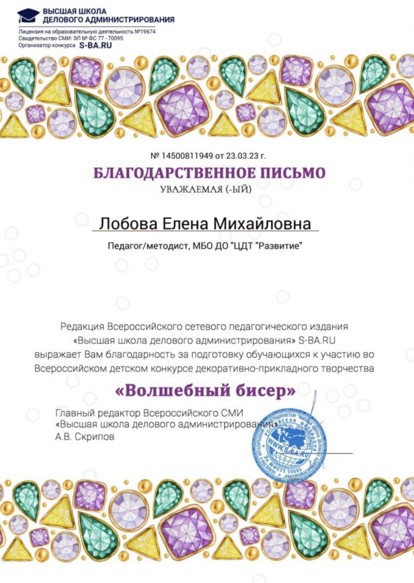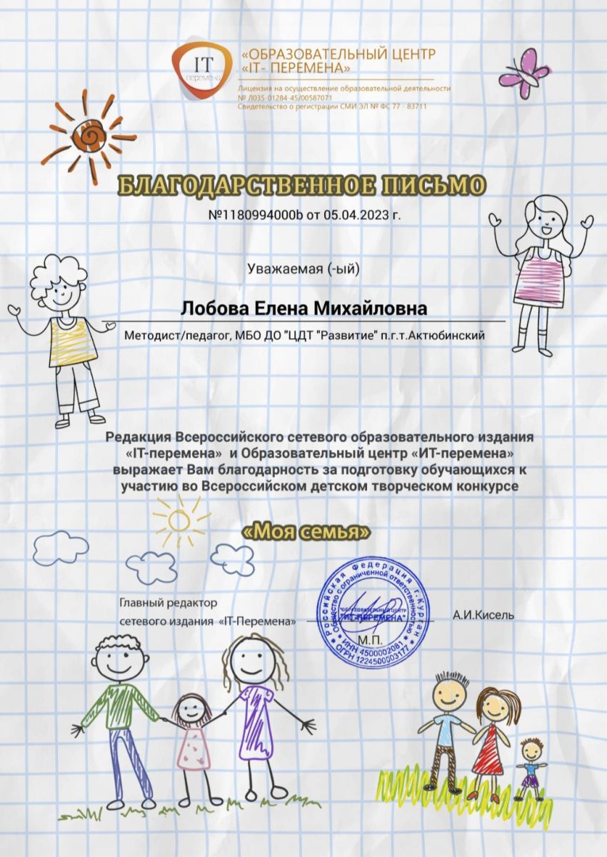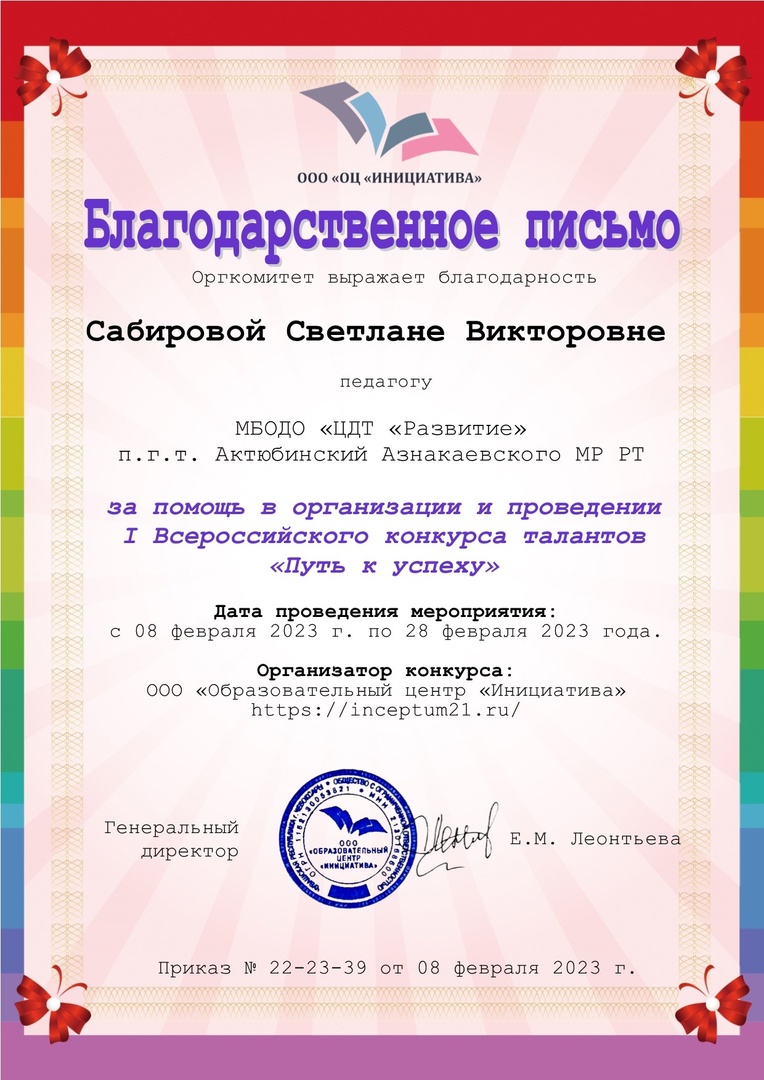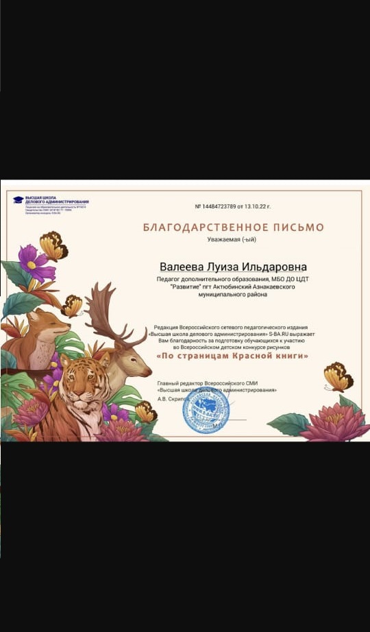 Благодарственное письмо за подготовку обучающихся в конкурсе "Мой яркий мир", педагог Валеева Л.И.