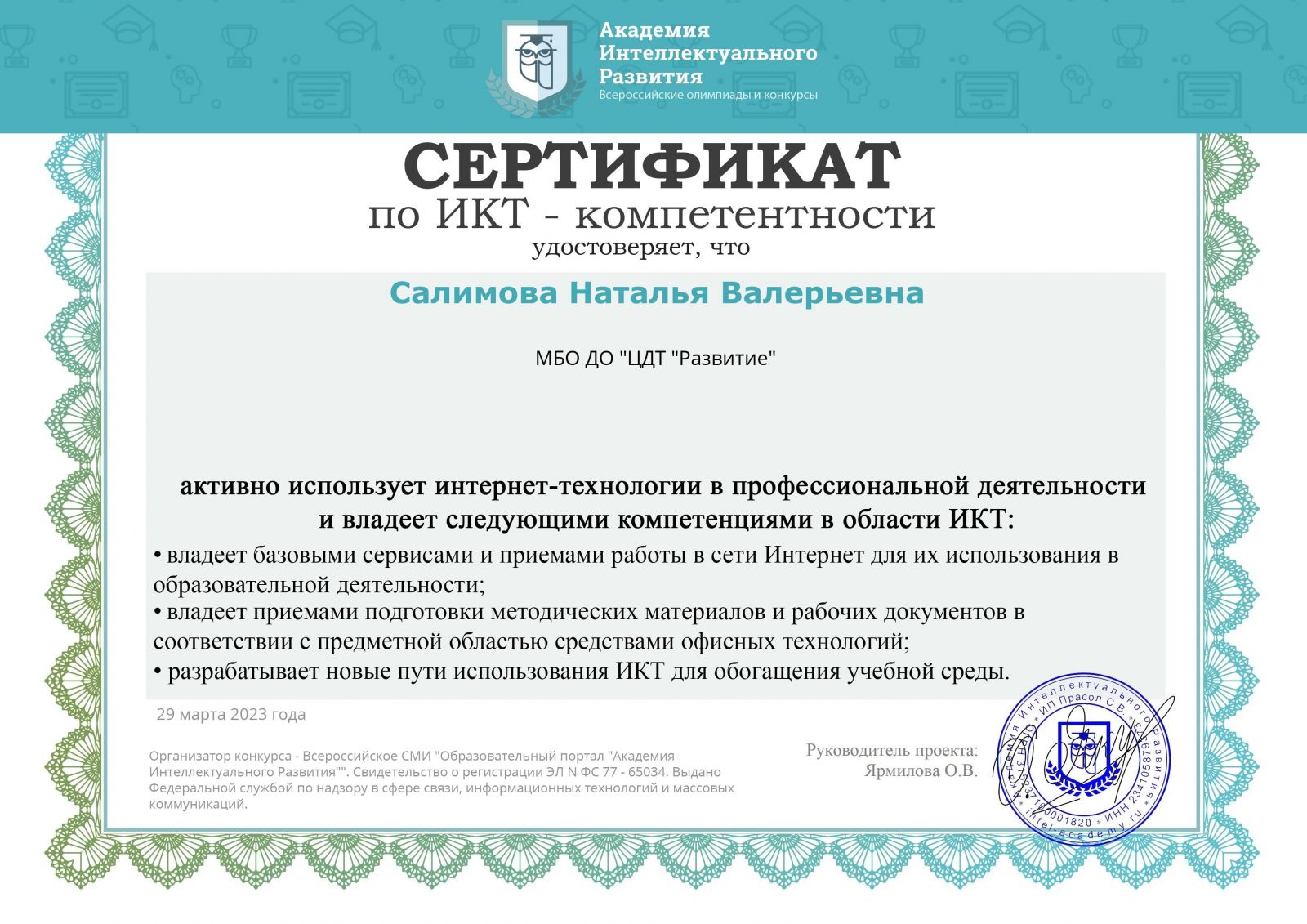 Сертификат по ИКТ - компетентности , педагог/методист Салимова Н.В.
