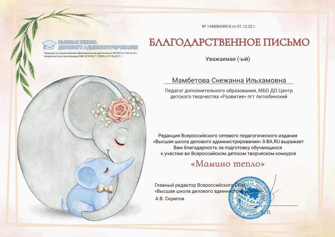 Благодарственное письмо за подготовку обучающихся к конкурсу "Мамино тепло", педагог Мамбетова С.И.