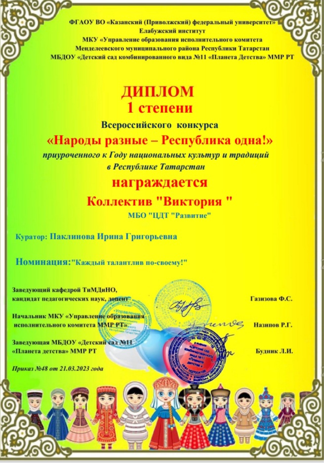 Диплом 1 степени в конкурсе "Педагог эксперт", коллектив Виктория, педагог Паклинова И.Г.