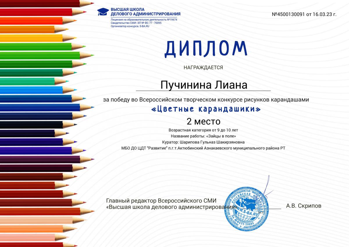Диплом за 2 место в конкурсе "Цветные карандашики", участница Пучинина Л., педагог Шарипова Г.Ш.