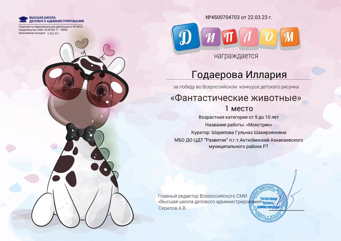 Диплом за 2 место в конкурсе "Цветные карандашики", участница Годаерова И., педагог Шарипова Г.Ш.