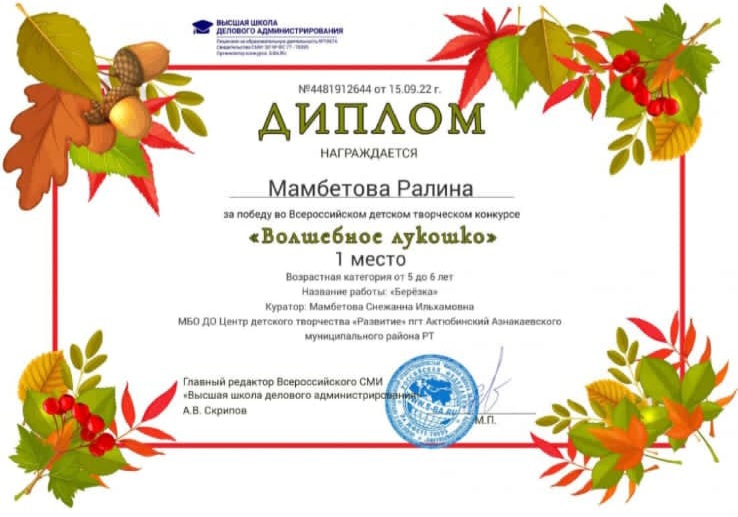 Диплом за 1 место в конкурсе "Волшебное лукошко",участница Мамбетова Р., педагог Мамбетова С.И.