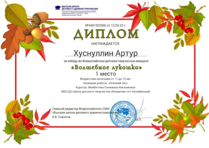 Диплом за 1 место в конкурсе "Волшебное лукошко",участник Хуснуллин А., педагог Мамбетова С.И.