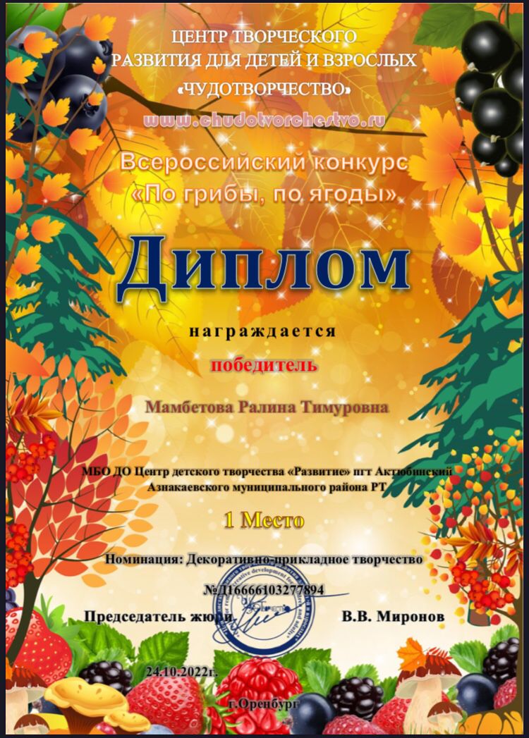 Диплом за 1 место в конкурсе "По грибы, по ягоды", участница Мамбетова Р., педагог Мамбетова С.И.