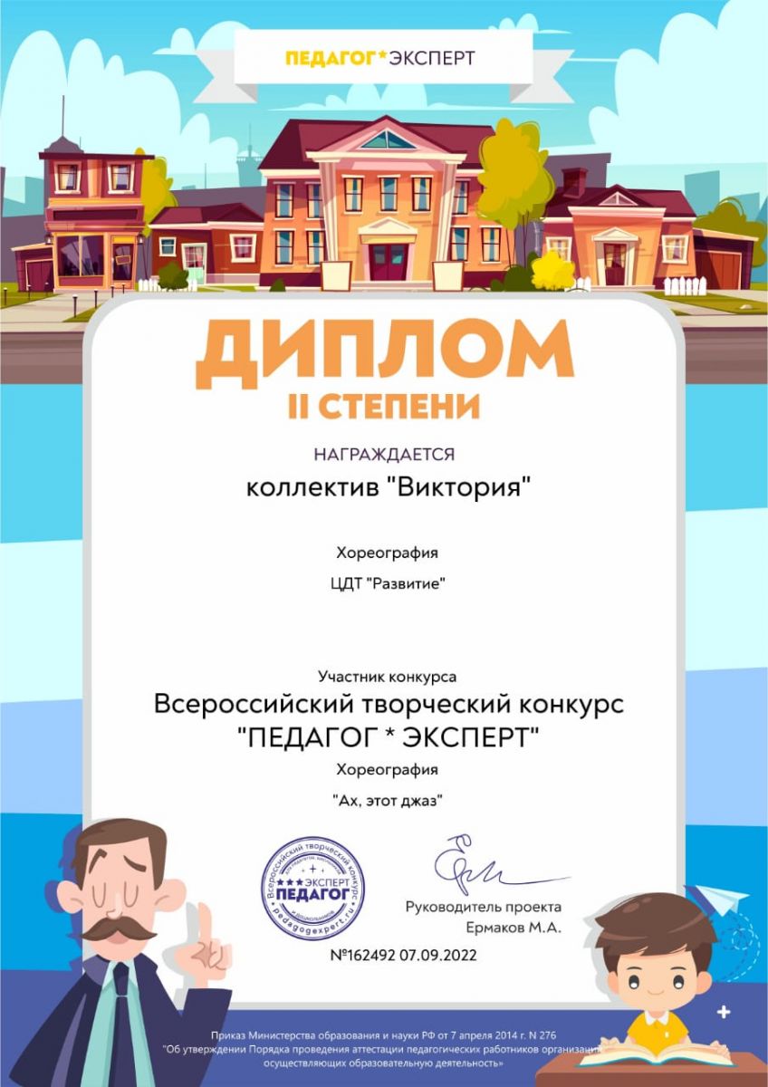 Диплом 2 степени в конкурсе "Педагог эксперт", коллектив Виктория, педагог Паклинова И.Г.