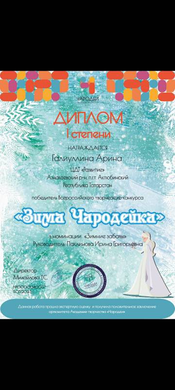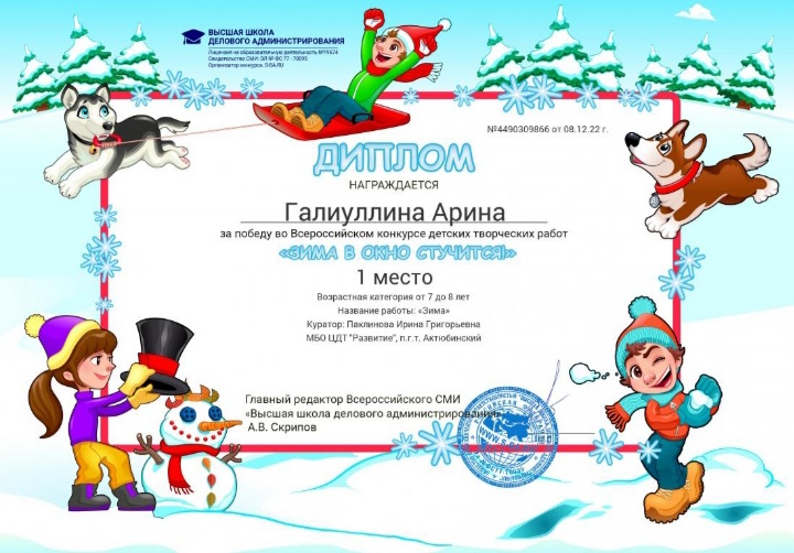 Диплом за 1 место в конкурсе "Зима в окно стучится", участница Галиуллина А., педагог Паклинова И.Г.