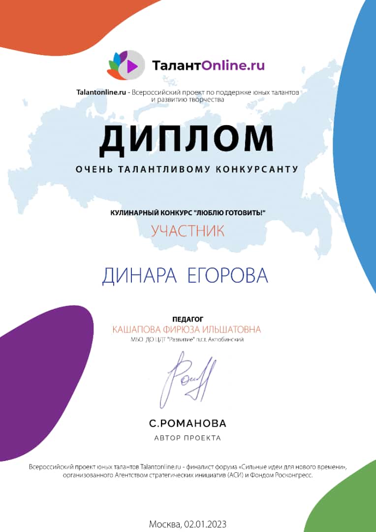 Диплом участника кулинарного конкурса "Люблю готовить", участница Егорова Д., педагог Кашапова Ф.И.