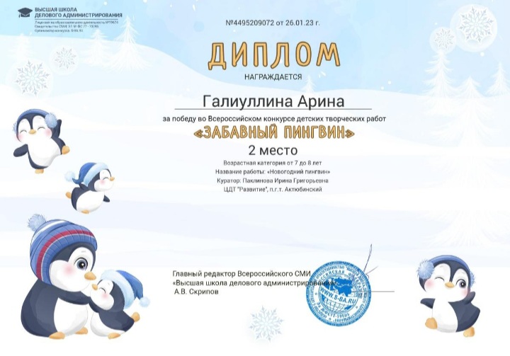 Диплом за 2 место в конкурсе "Забавный Пингвин", участница Галиуллина А., педагог Паклинова И.Г.