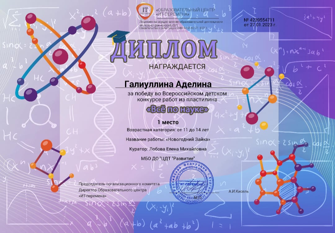 Диплом за 1 место в конкурсе "Все по науке",участница Галиуллина А., педагог Лобова Е.М.