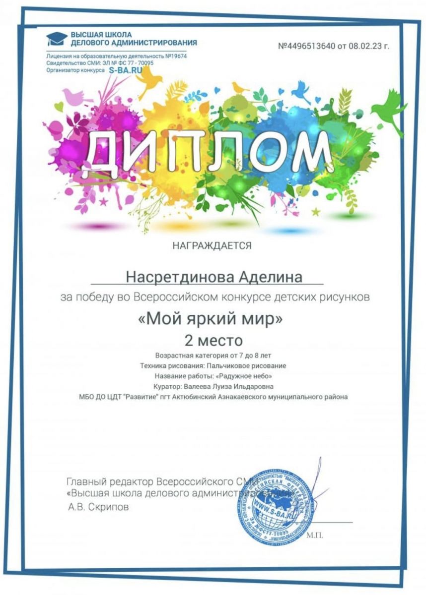 Диплом за 2 место в конкурсе "Мой яркий мир", участница Муртазина С., педагог Валеева Л.И.