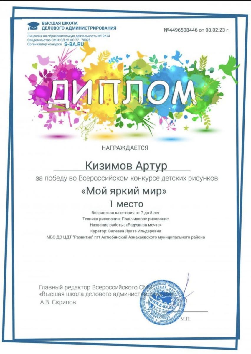 Диплом за 1 место в конкурсе "Мой яркий мир", участник Кизимов А., педагог Валеева Л.И.