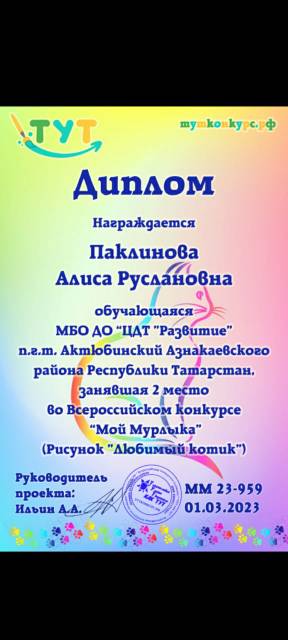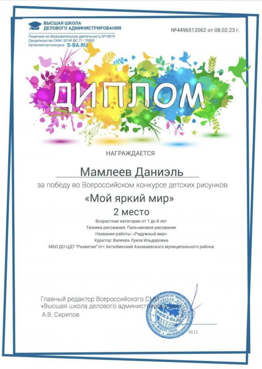Диплом за 2 место в конкурсе "Мой яркий мир", участник Мамлеев Д., педагог Валеева Л.И.